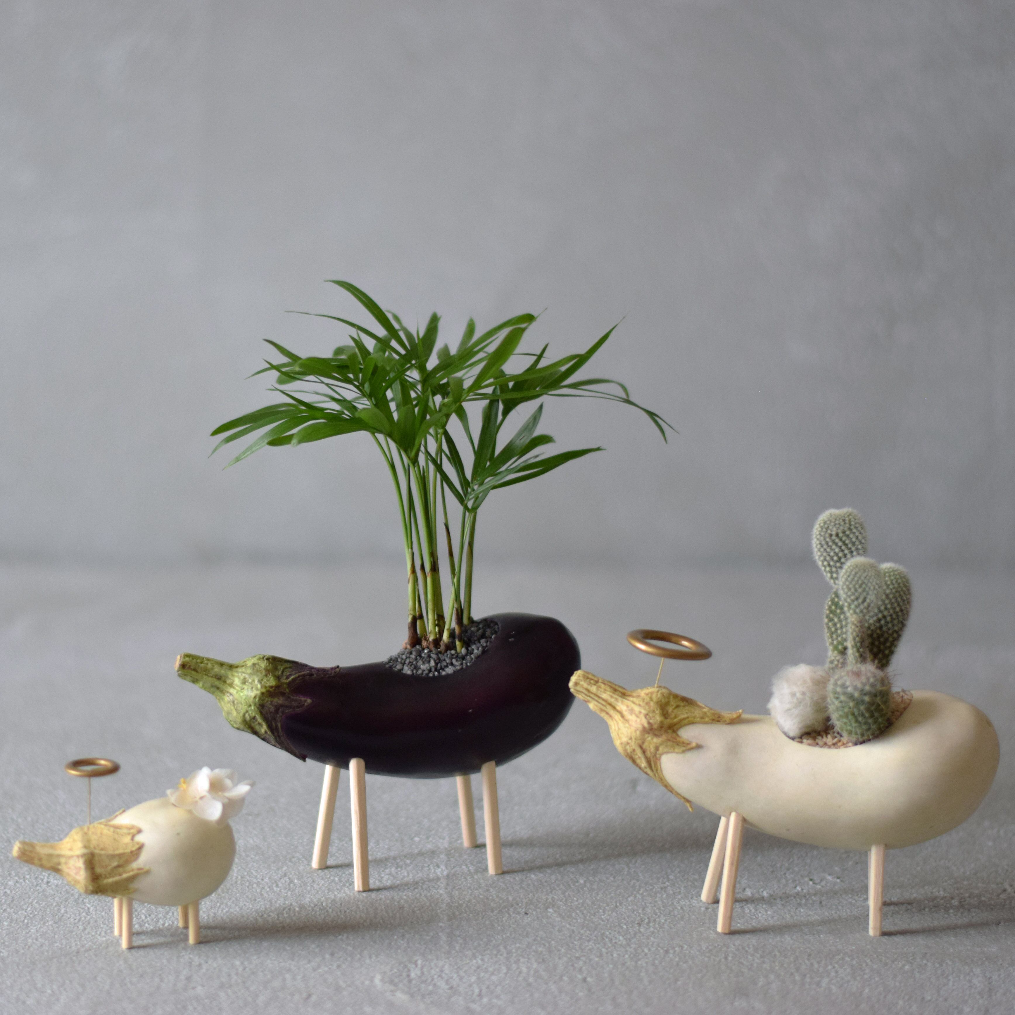 植物が生えていて賑やかな樹脂製の精霊馬のプランターオブジェです。