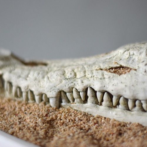 樹脂製のワニの頭骨のプランターとモルタルの器、ユーフォルビア・ゴッドレベイ交配種の寄せ植えのセットです。独特なドライな雰囲気でお洒落です。