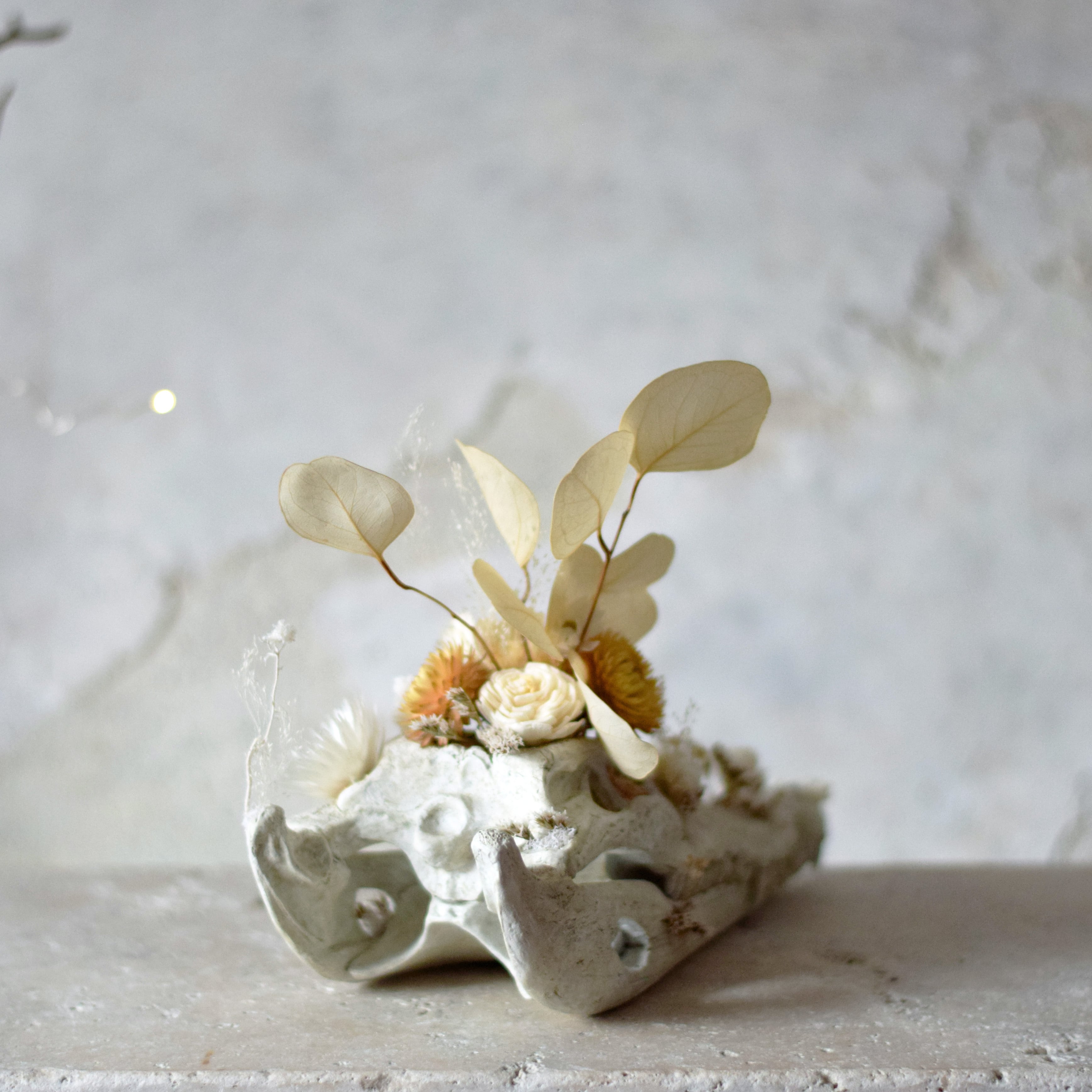 風化した骨から新しく植物が生えてきたイメージで、植物と対比して引き立てあえるものとして骨をチョイスです。