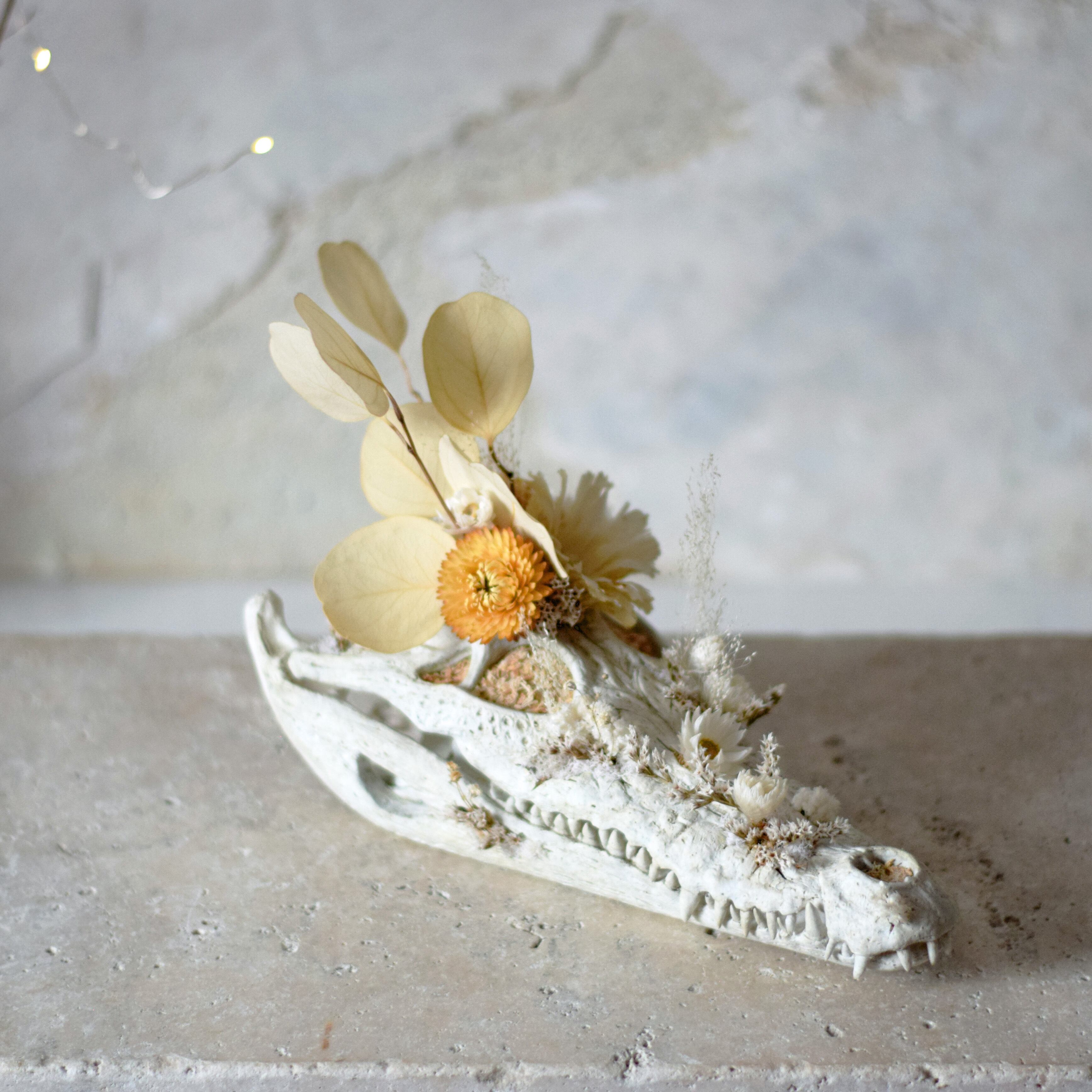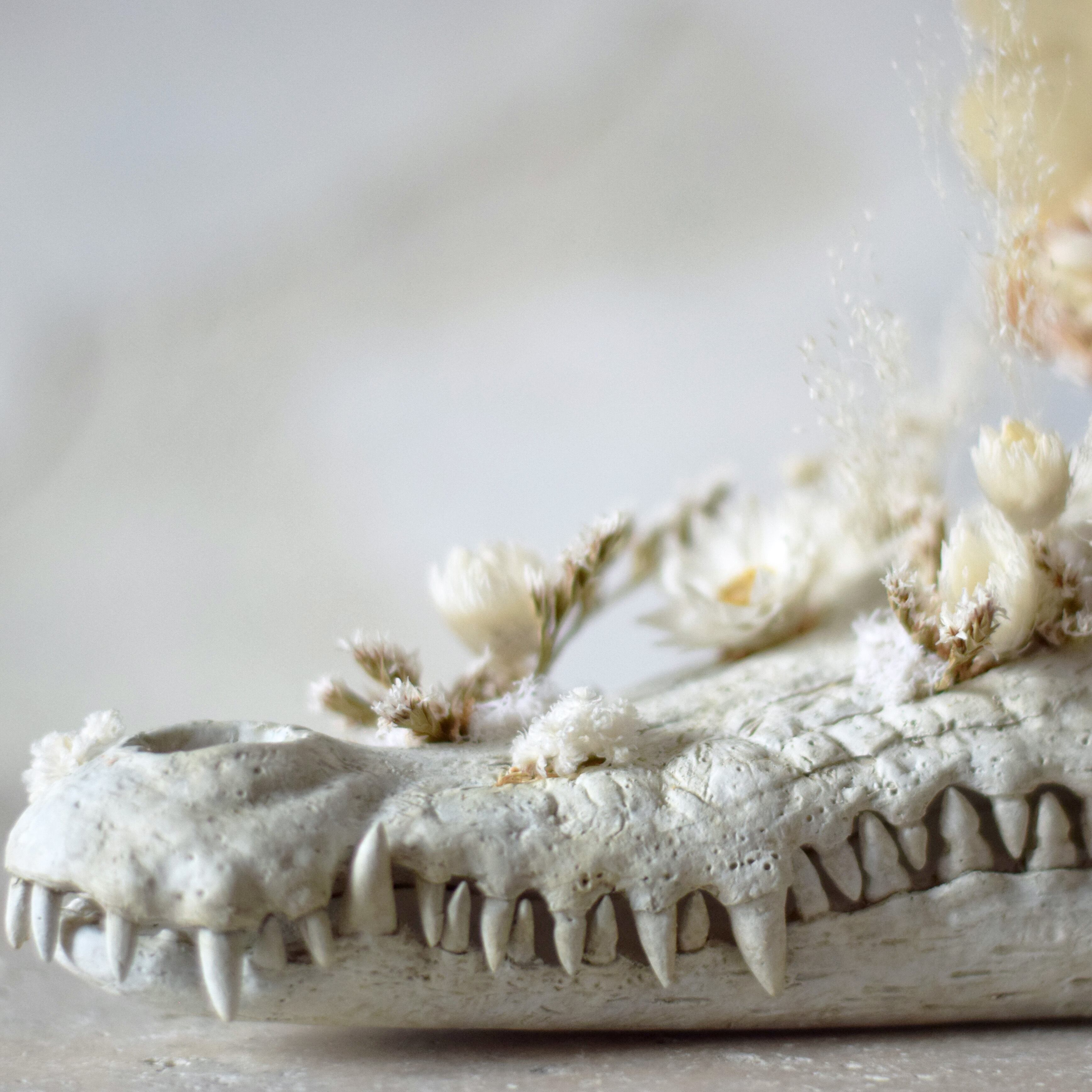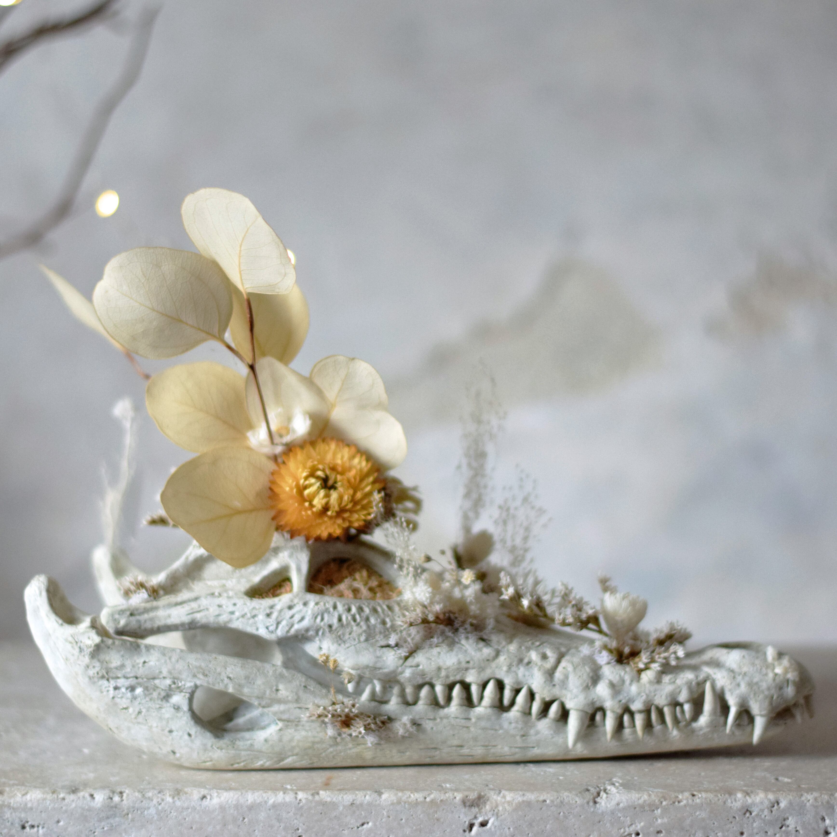 生まれた時から死んでいる笑顔と歯並びがチャームポイントなワニの頭骨プランターオブジェです。