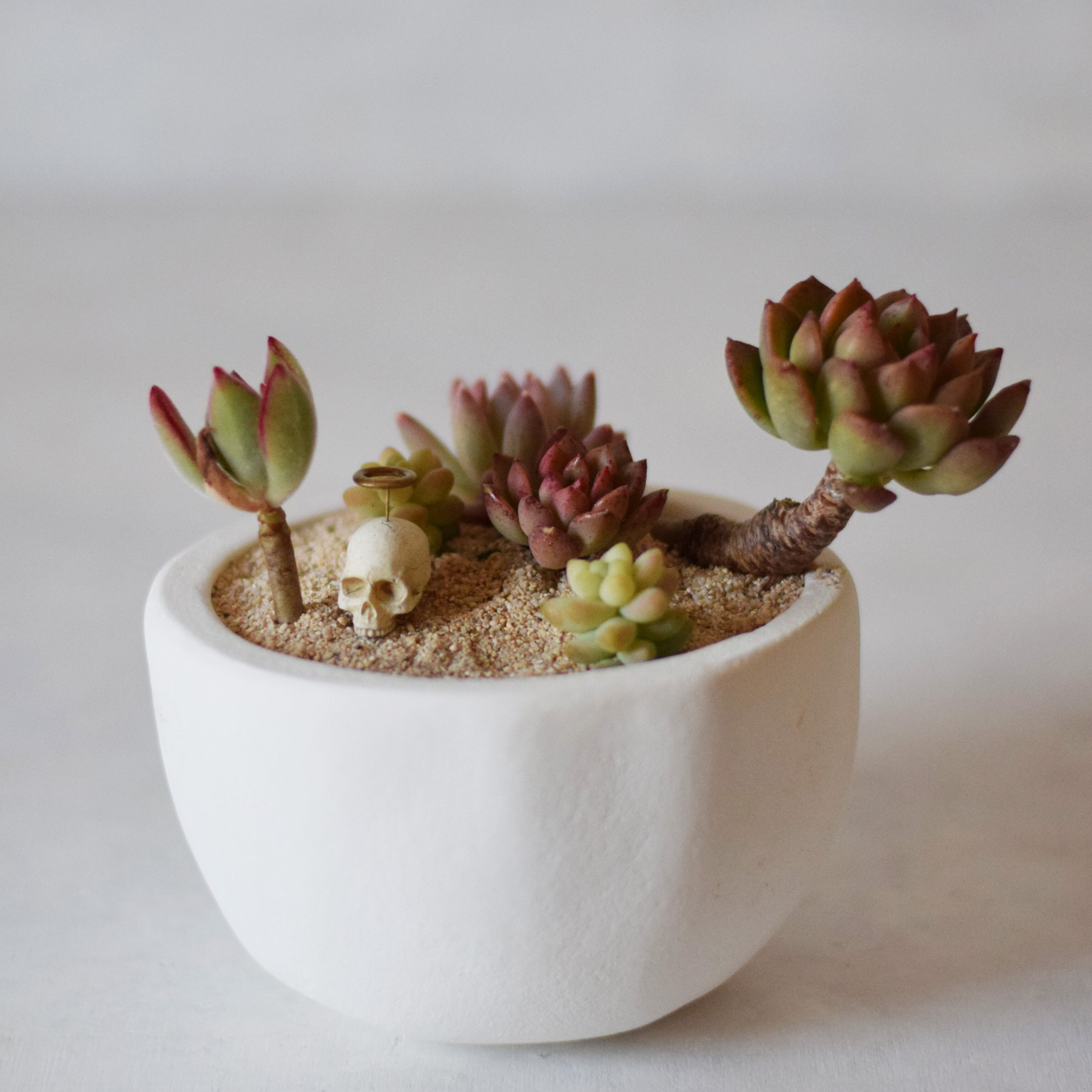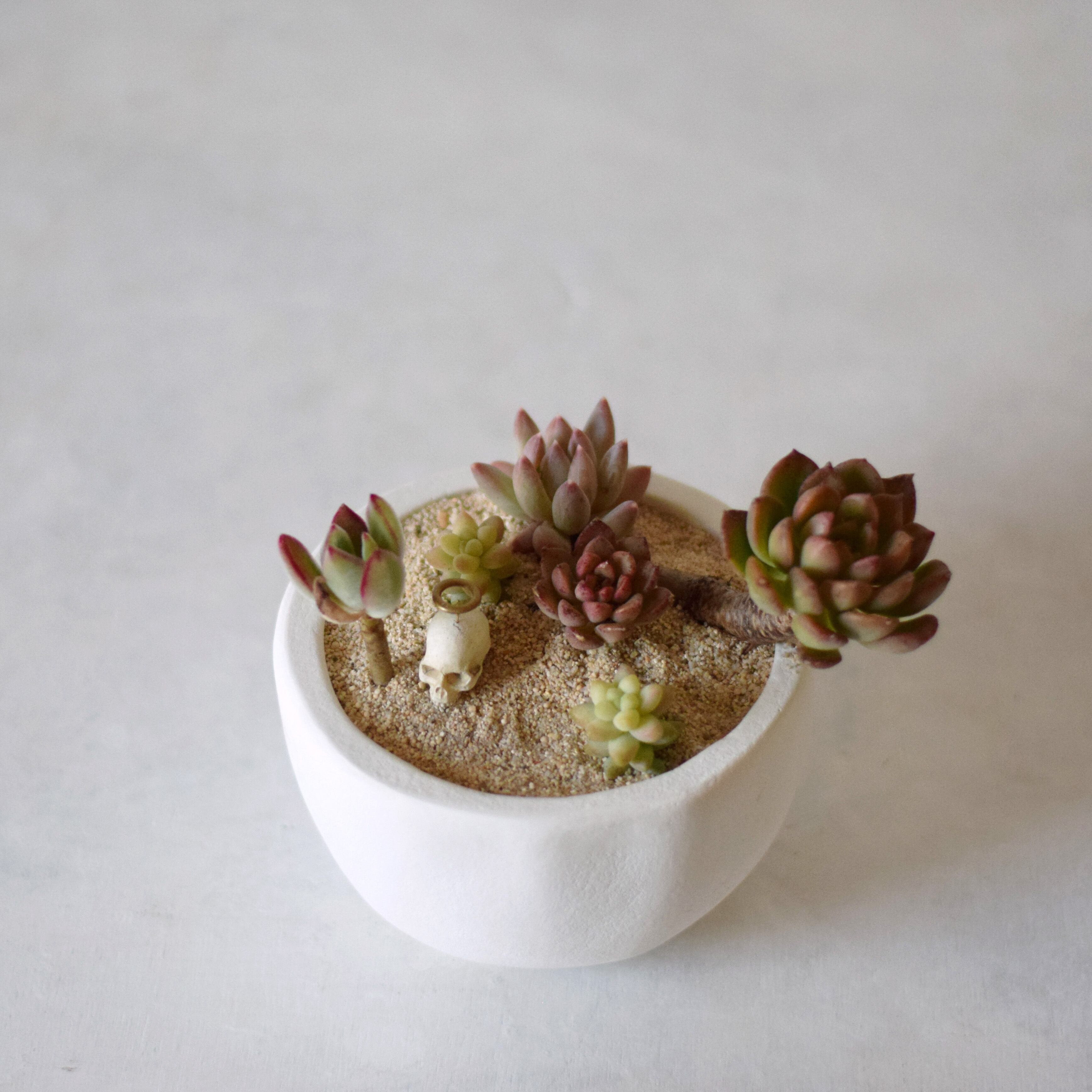 手びねりしたゆるい形状のホワイトモルタルの器に各種エケベリアを植えています。