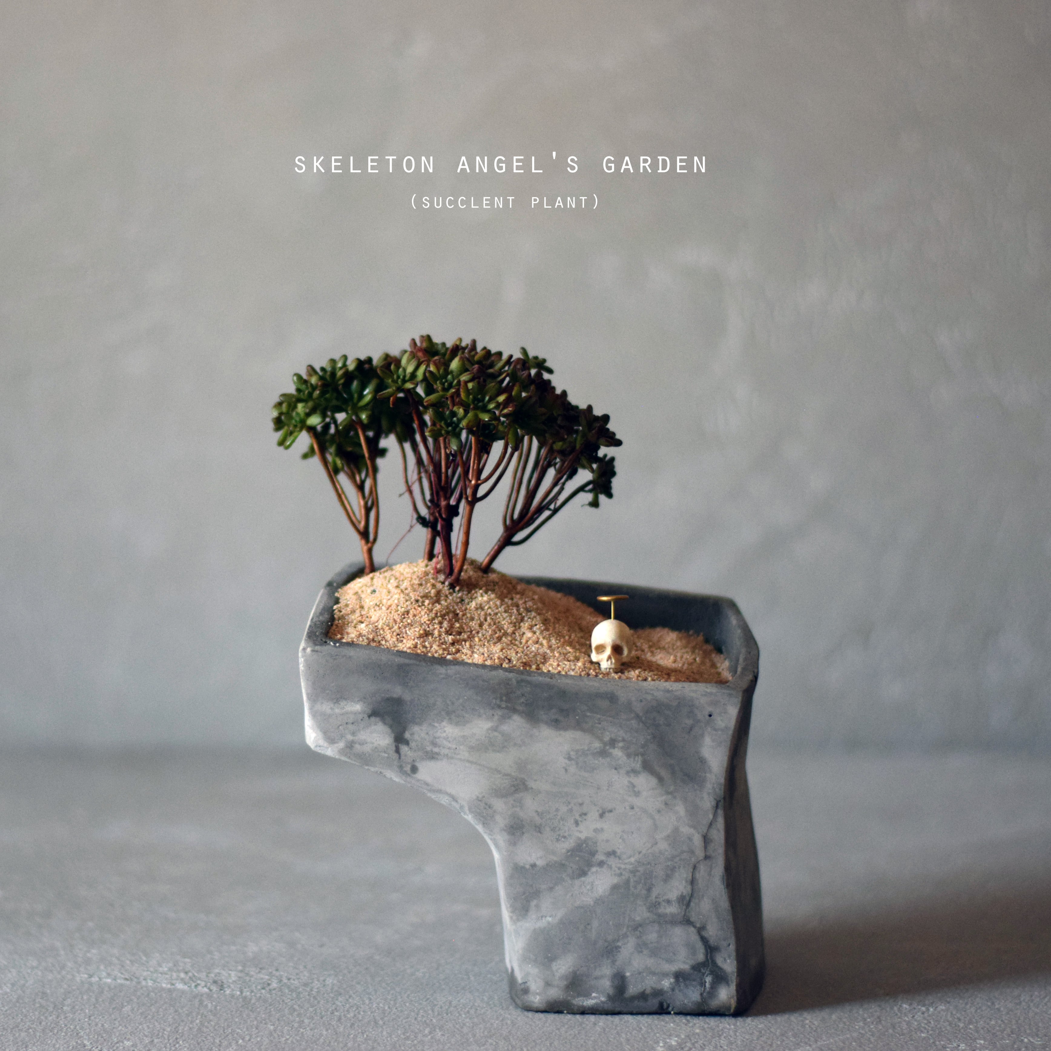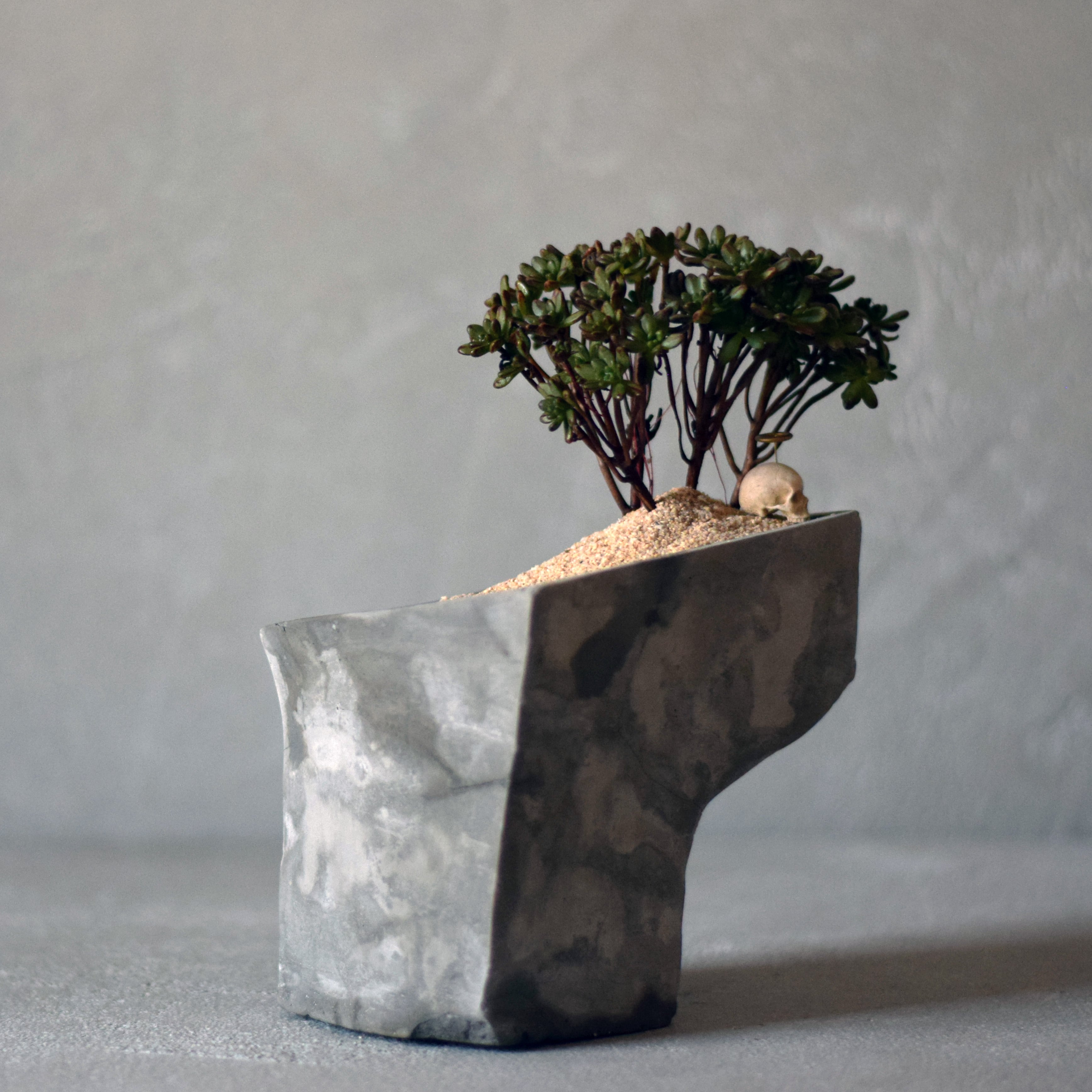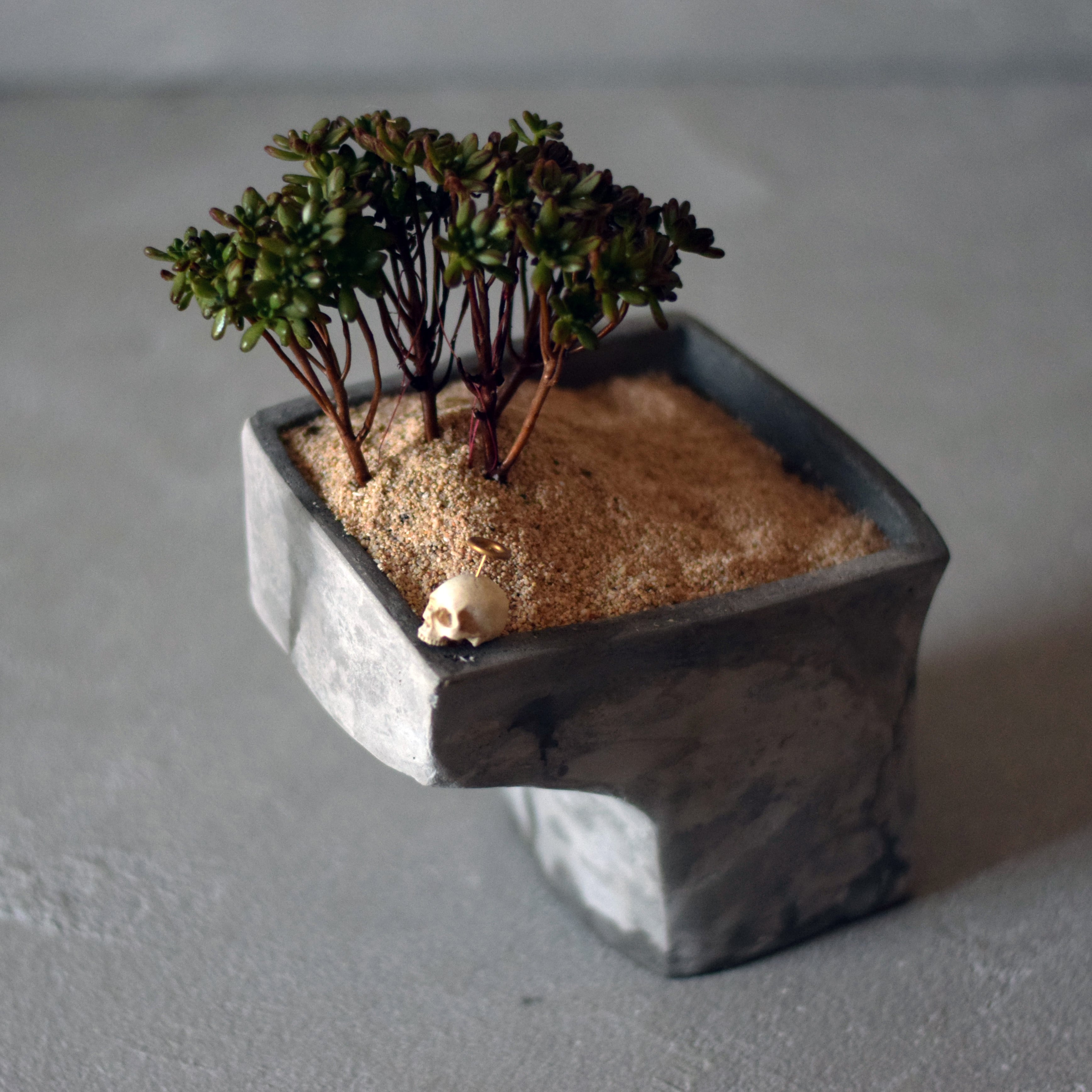 手びねりした個性的な形状ののモルタルの器に多肉植物・小人の祭りを植えています。