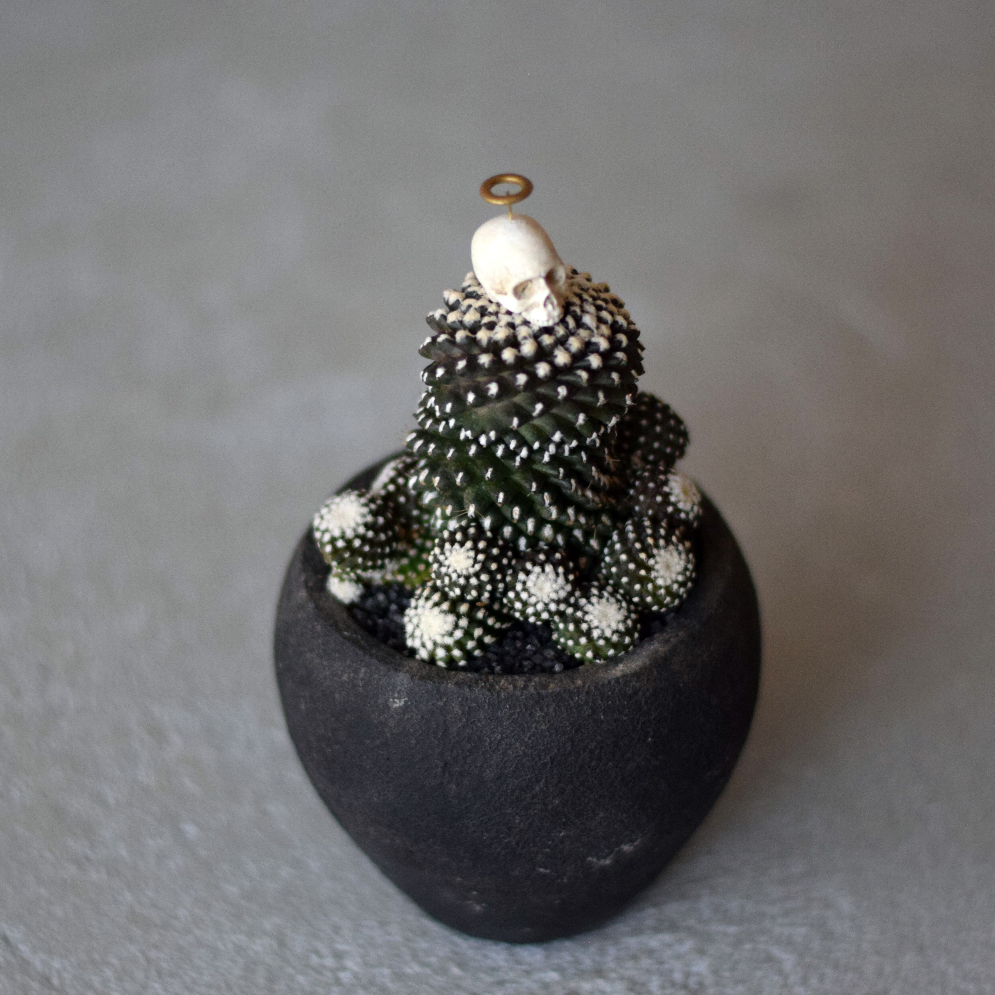 黒いモルタルの器に植えられた黒いサボテン、テヌイシマに住み着いていた上品な骸骨さんです。