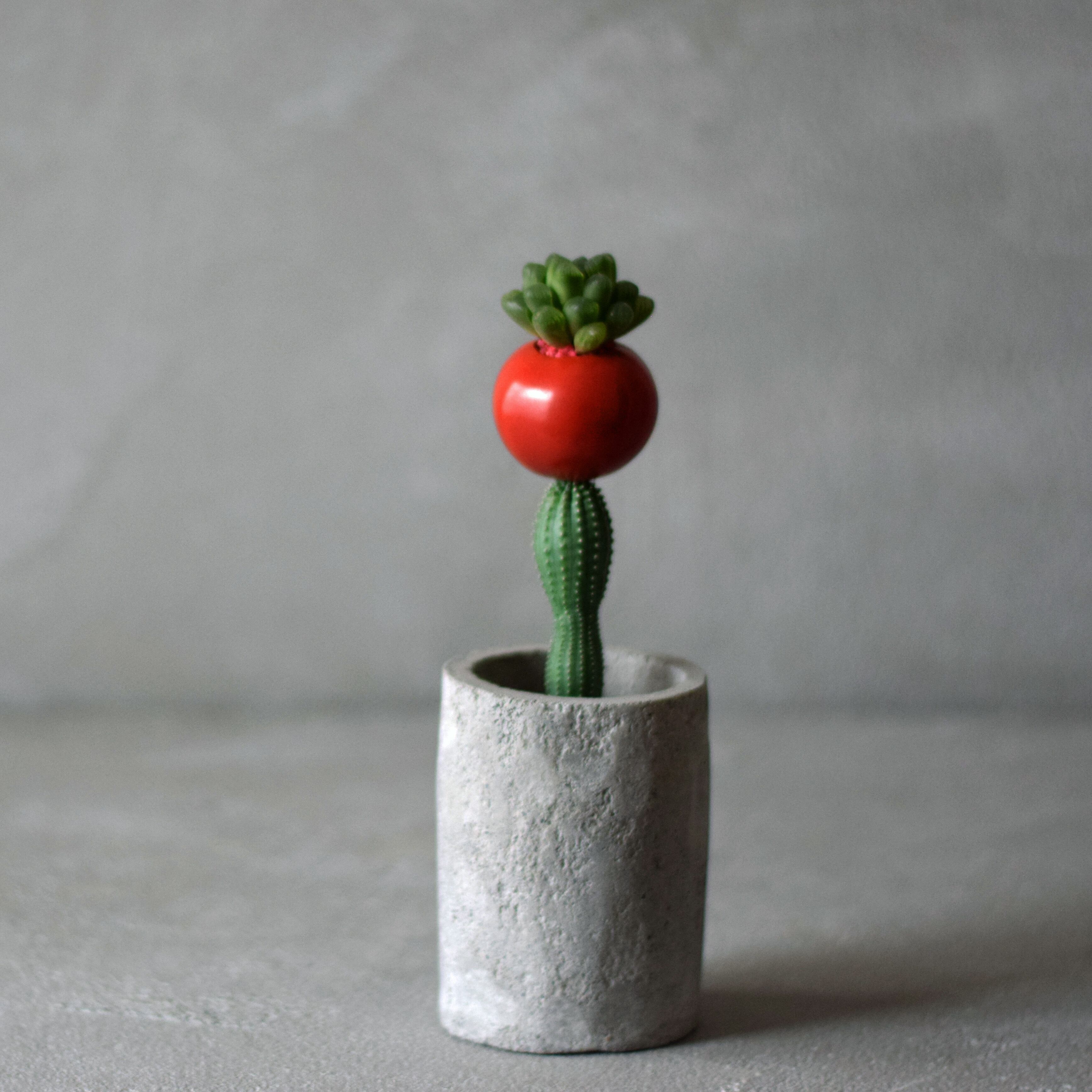 *モルタルの器、樹脂製のサボテンとトマトのアートプランターです。トマトは中が空洞になっていて土が入っており生きているハオルチア・オブツーサを植えています。