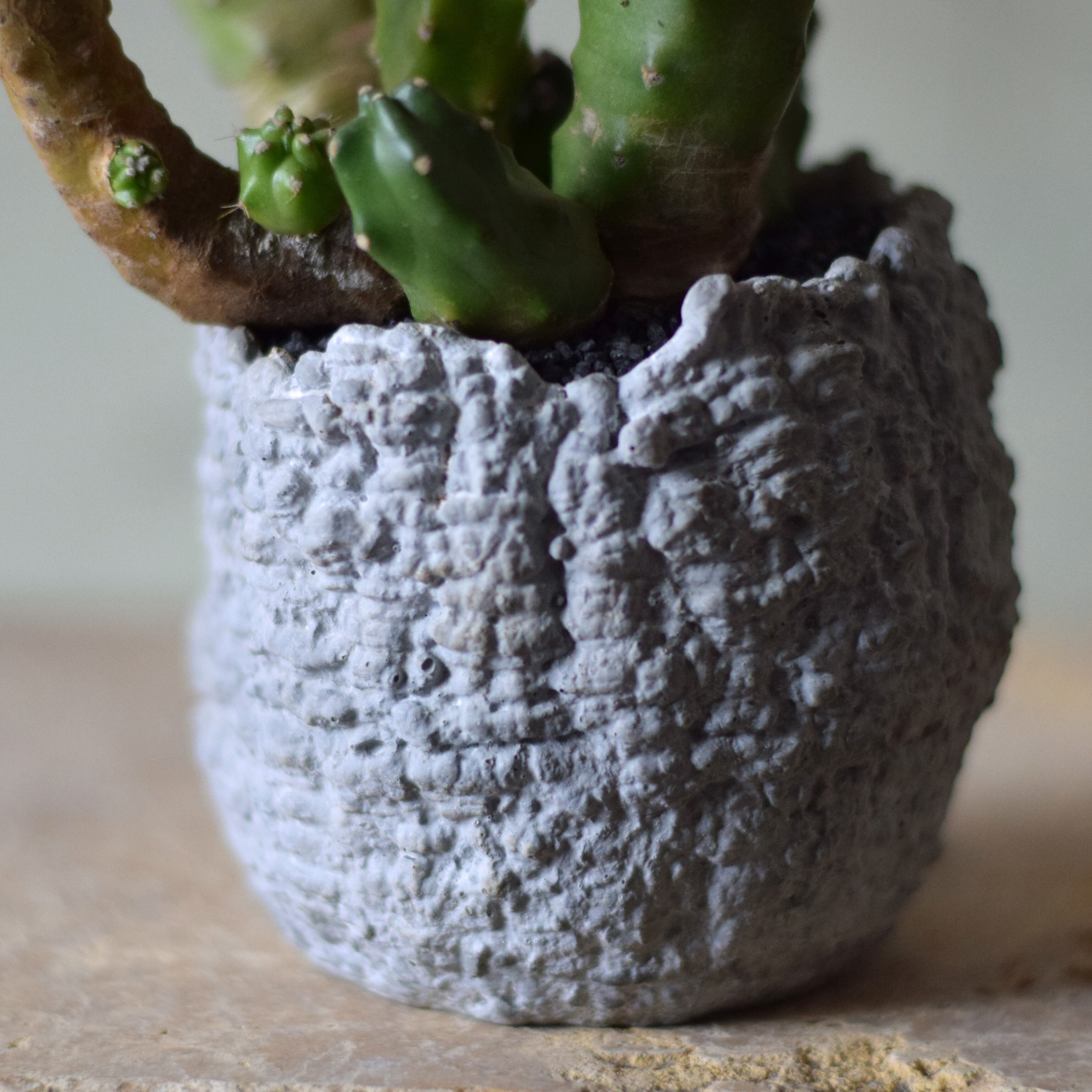 塊根植物の王様オペルクリカリア・パキプスをモチーフに制作したモルタル製プランターです。塗装をしていないモルタルそのままの色味です。