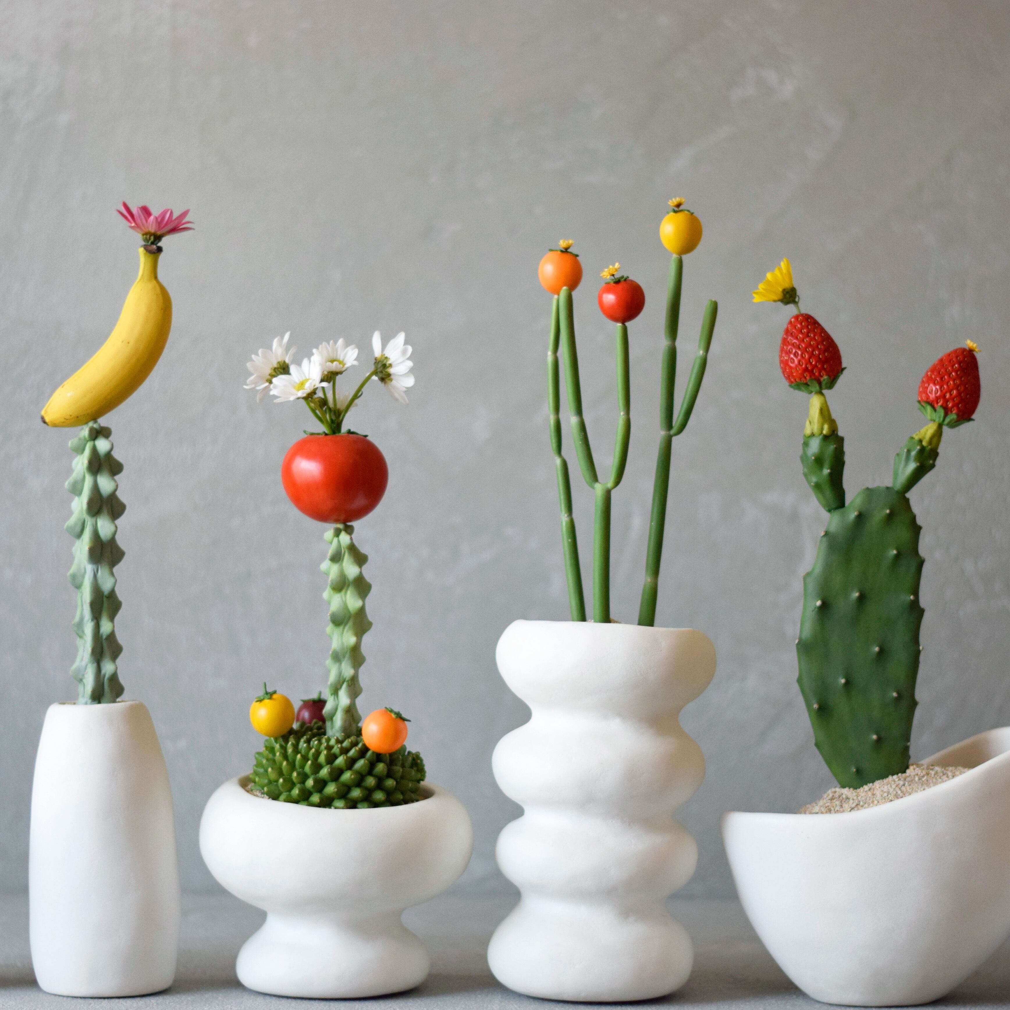 一点一点、手作りしたモルタルの器にフォロトシアン・グランディフローラムとプチトマトを継いだ樹脂製の造形作品を植えています。プチトマトには2ミリ程の小さな穴が空いていてドライフラワーが挿せる一輪挿しになっています。