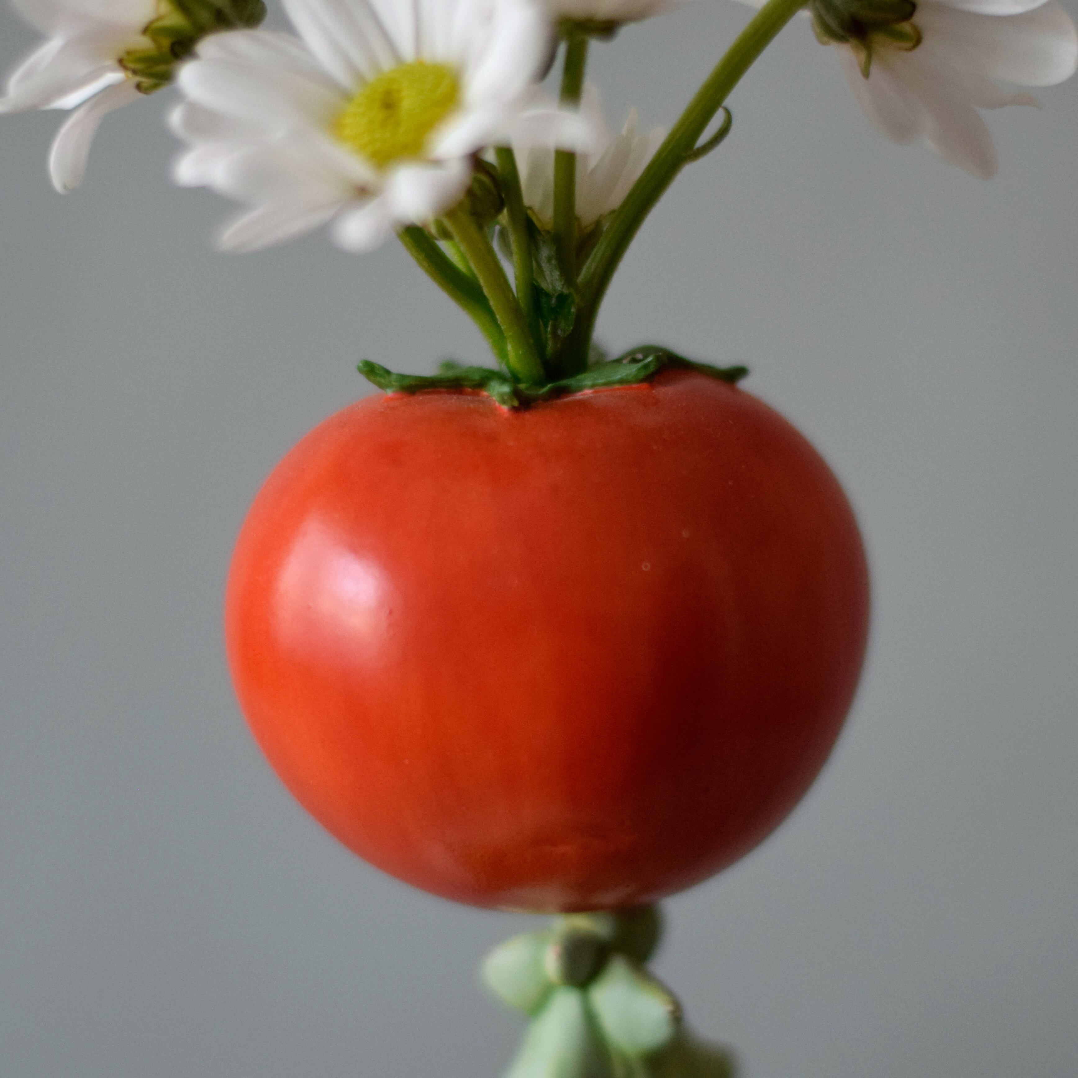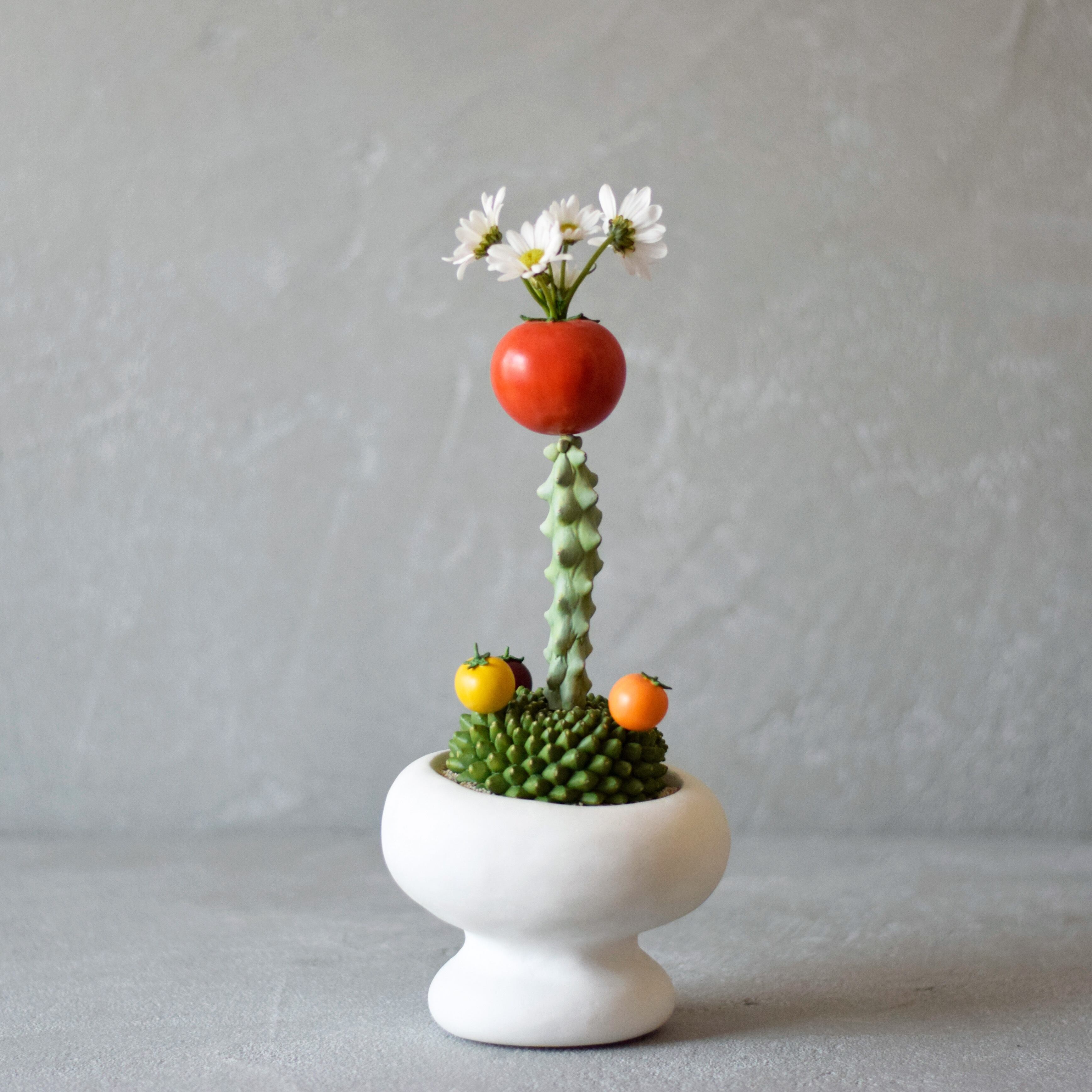 一点一点、手作りしたモルタルの器にサボテン・金洋丸と福禄竜神木、トマトとプチトマトを継いだ樹脂製の造形作品を植えています。トマトは内側が空洞になっていて小さな穴が空いていて水を入れお花を生けれる一輪挿しになっています。
