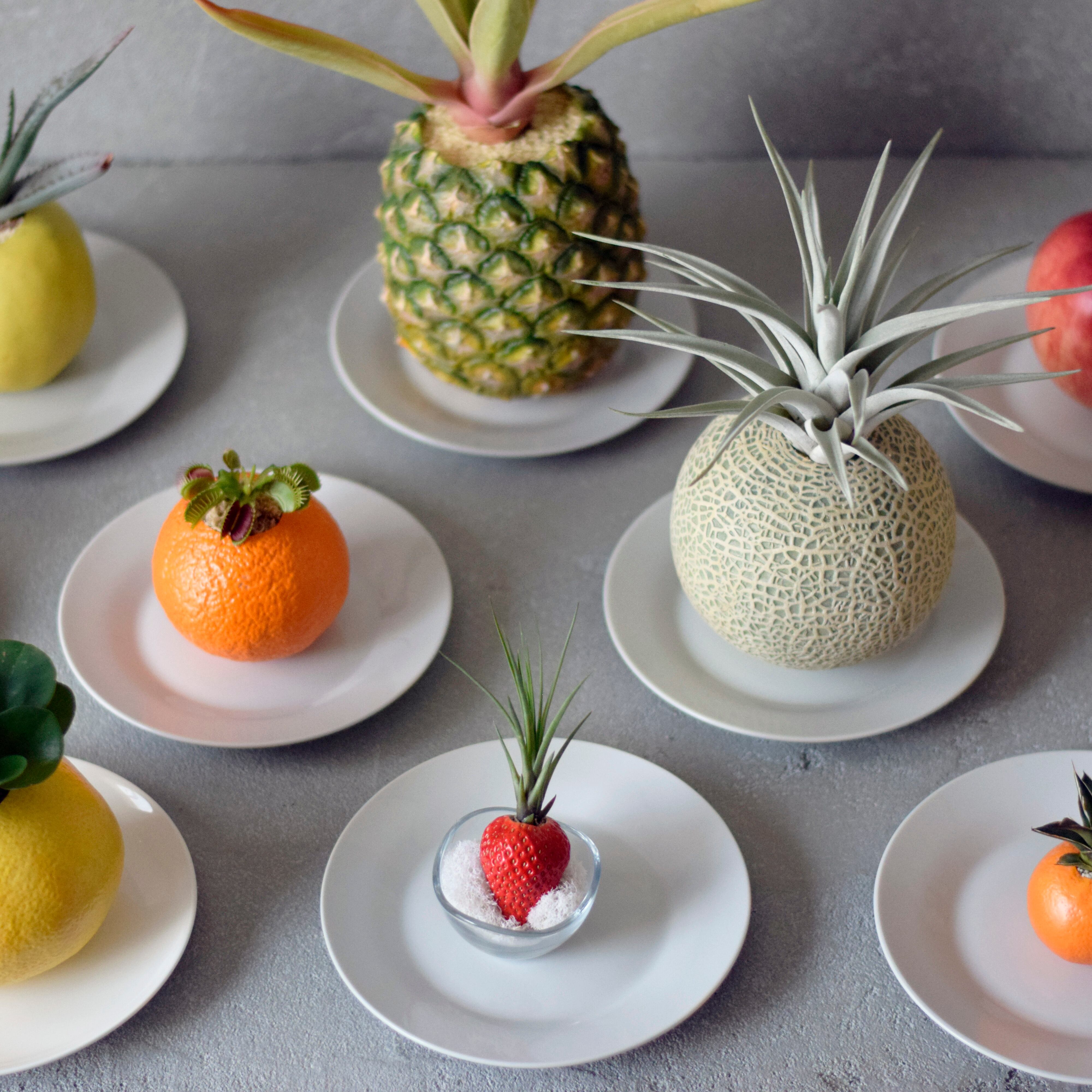 エアープランツ・ハリシーを乗せています。(このエアープランツは根が無いので水苔の上に乗っているだけです)白銀の葉がとても綺麗でメロンの繊細な色味とも合っていて上品な謎の果実になっています。明るく風通しのいい場所に置いてください。