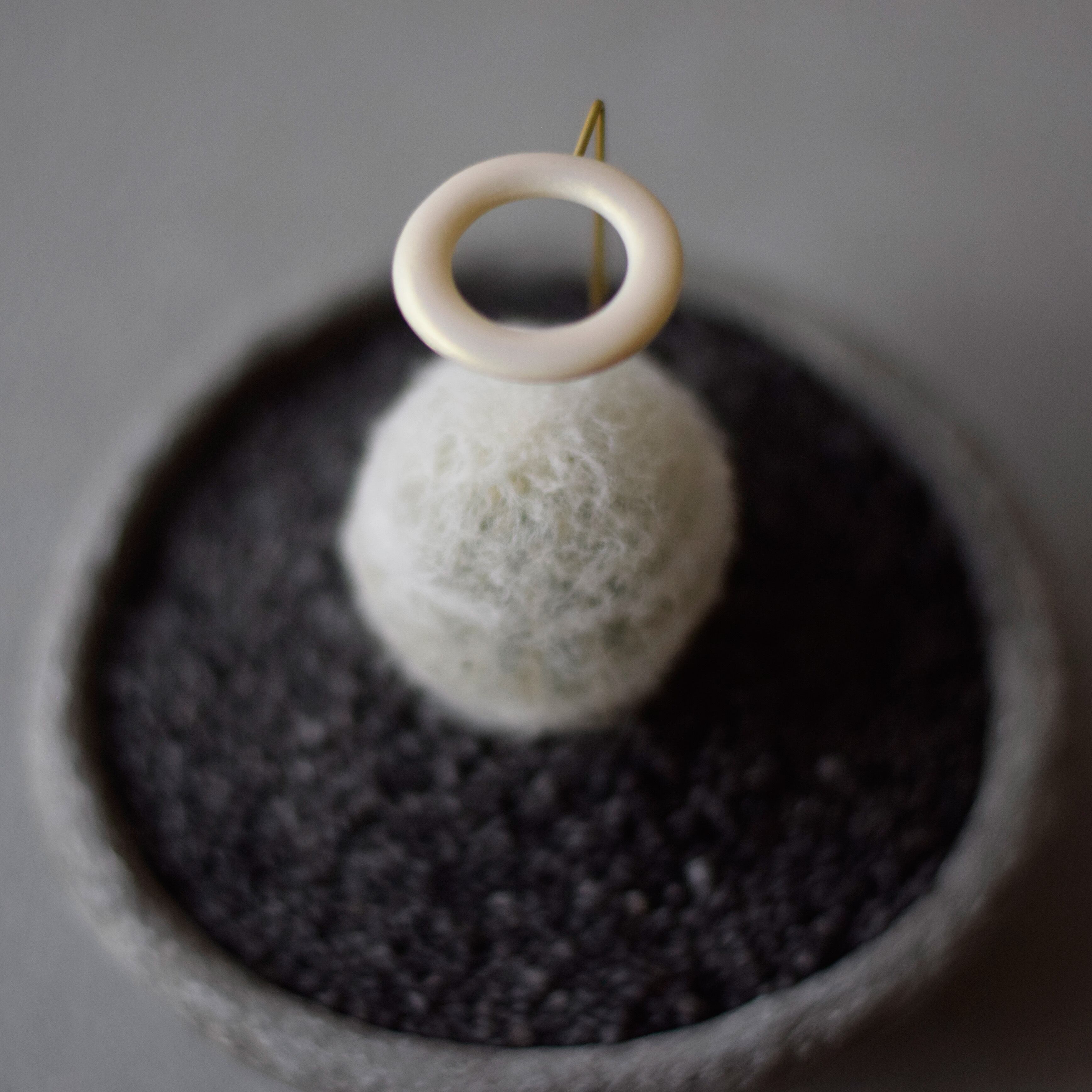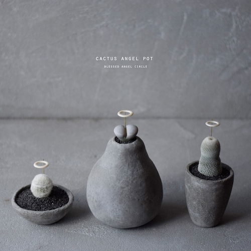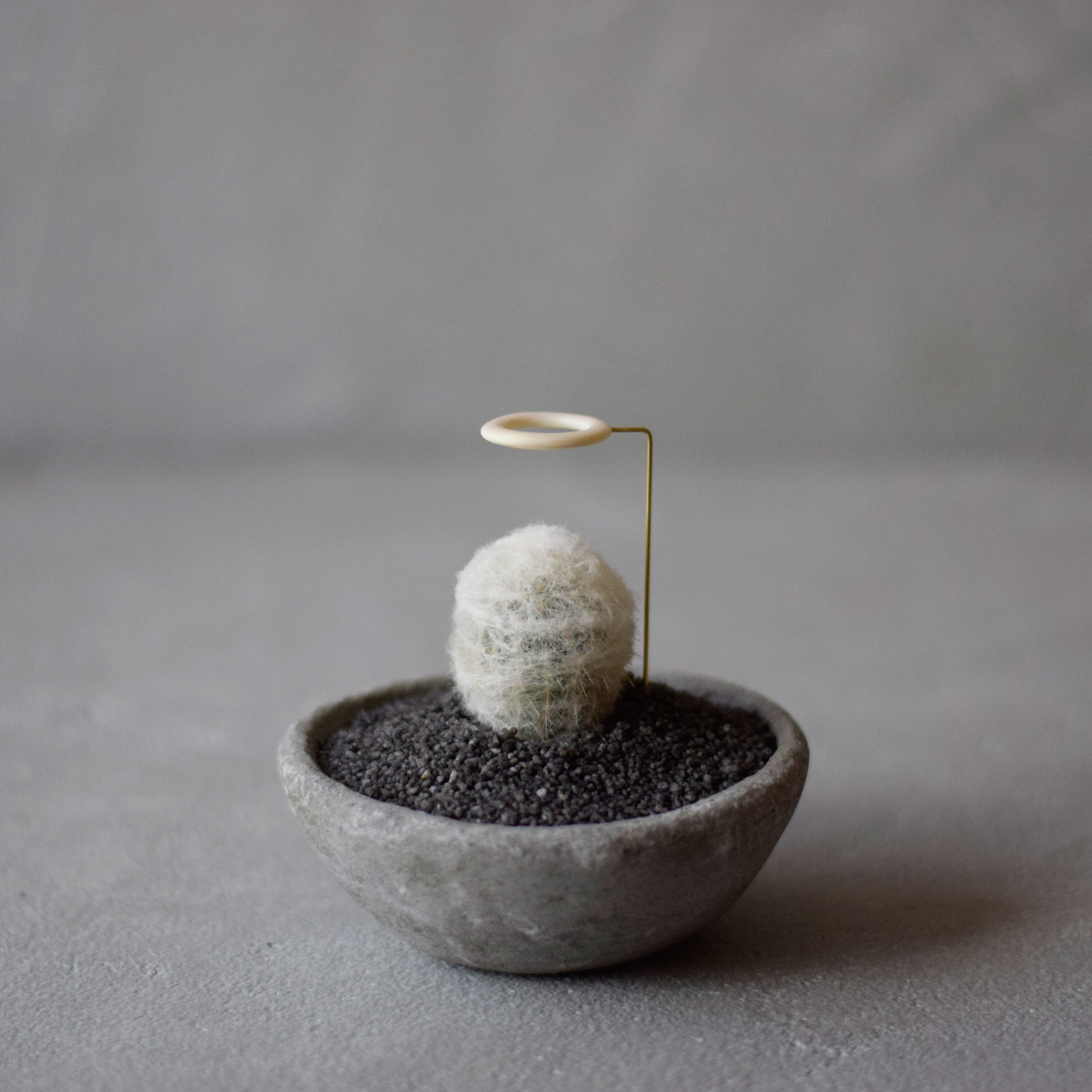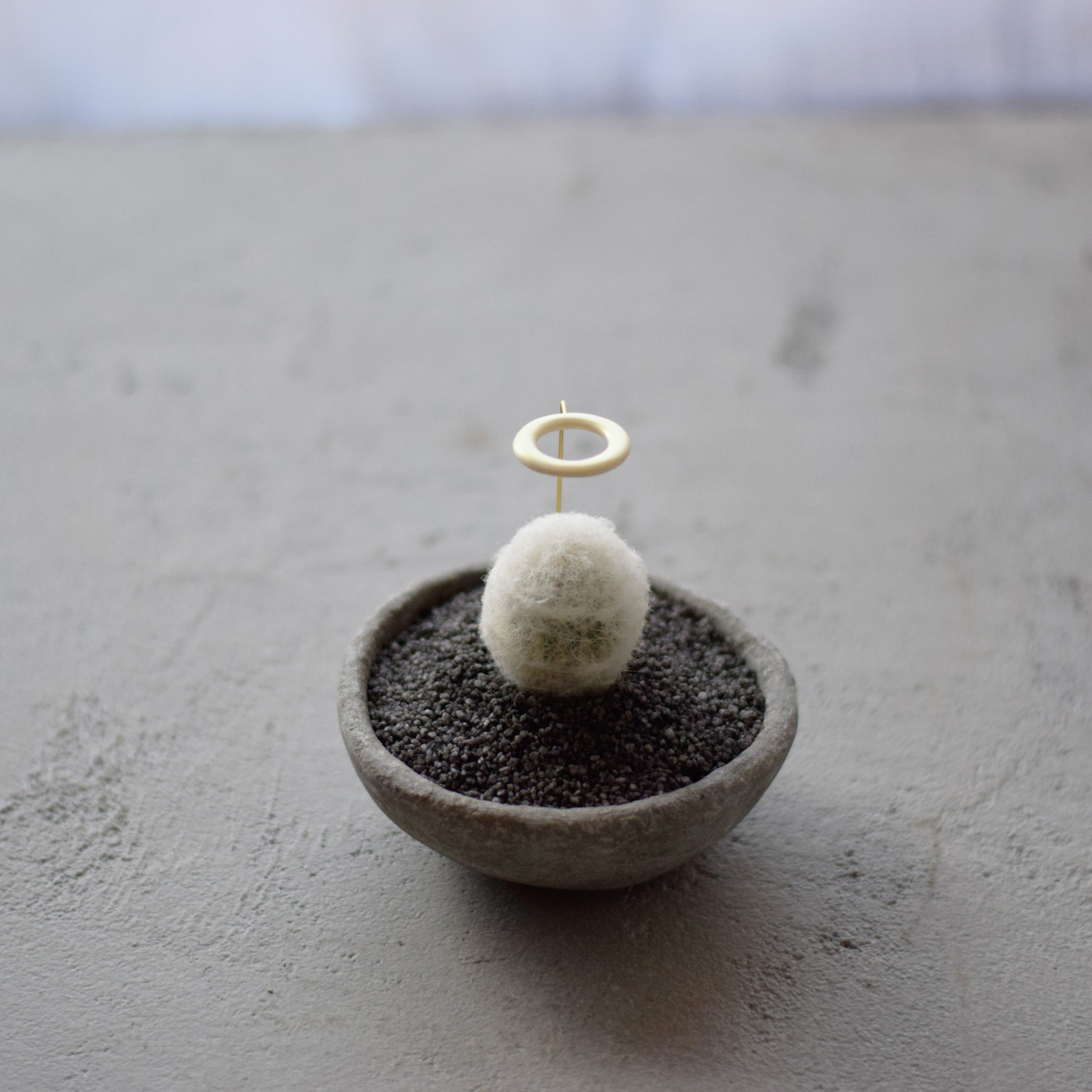 手作りのモルタルの器と天使の輪のガーデンピック、植物のセットです。