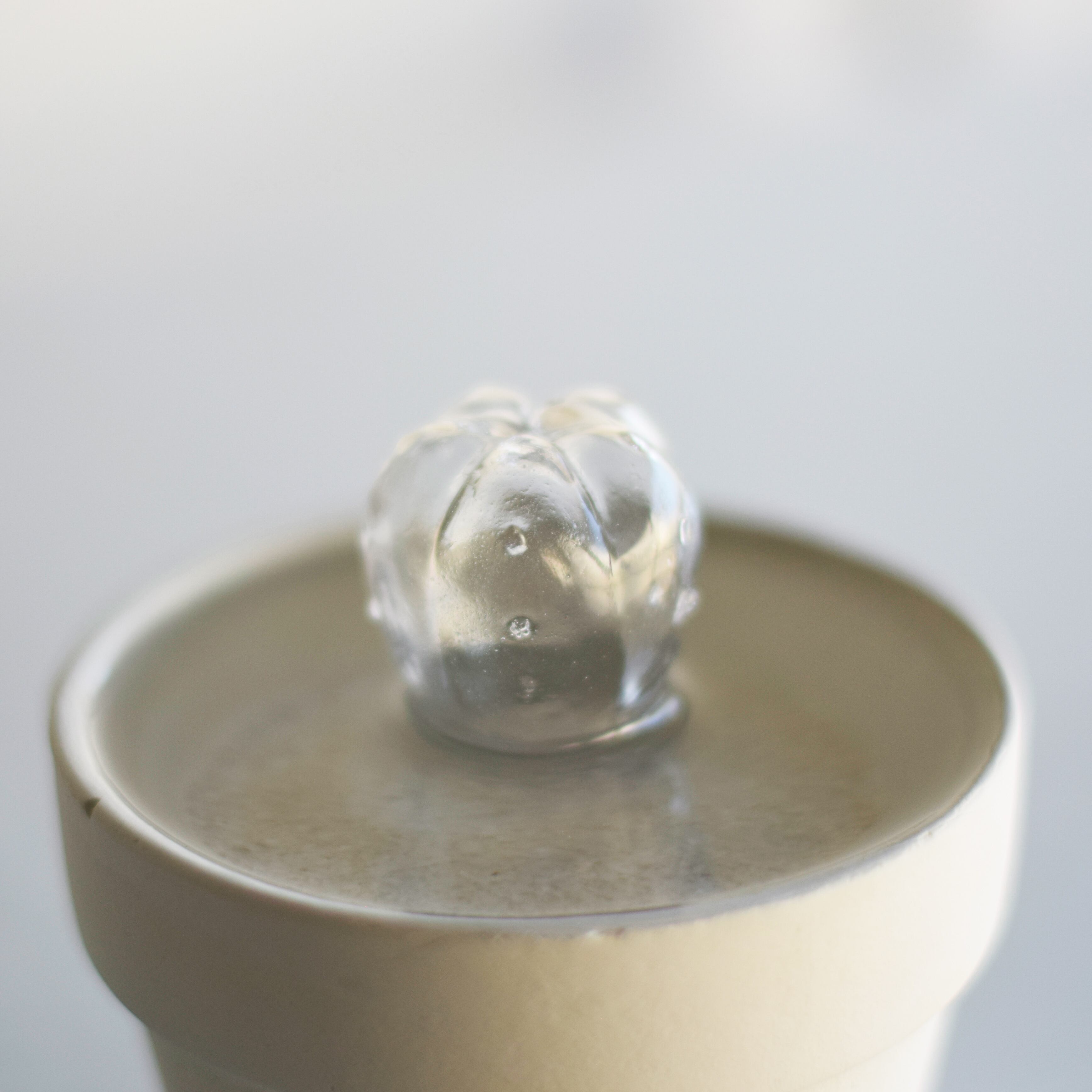 透明サボテンは内側が空洞になった薄い(厚さ1~2ミリ程)透明な樹脂で作った造形作品です。水を模した樹脂から生えています。