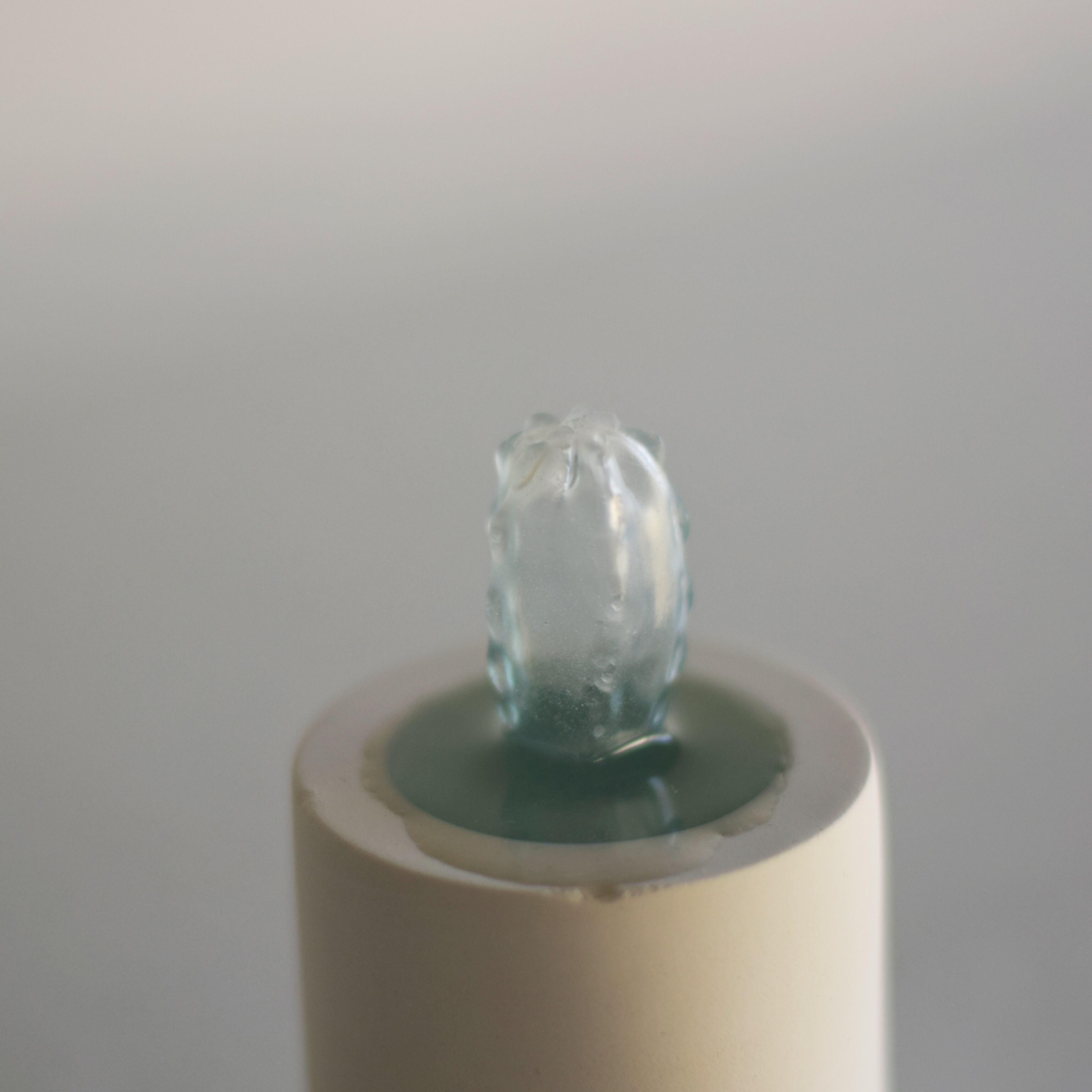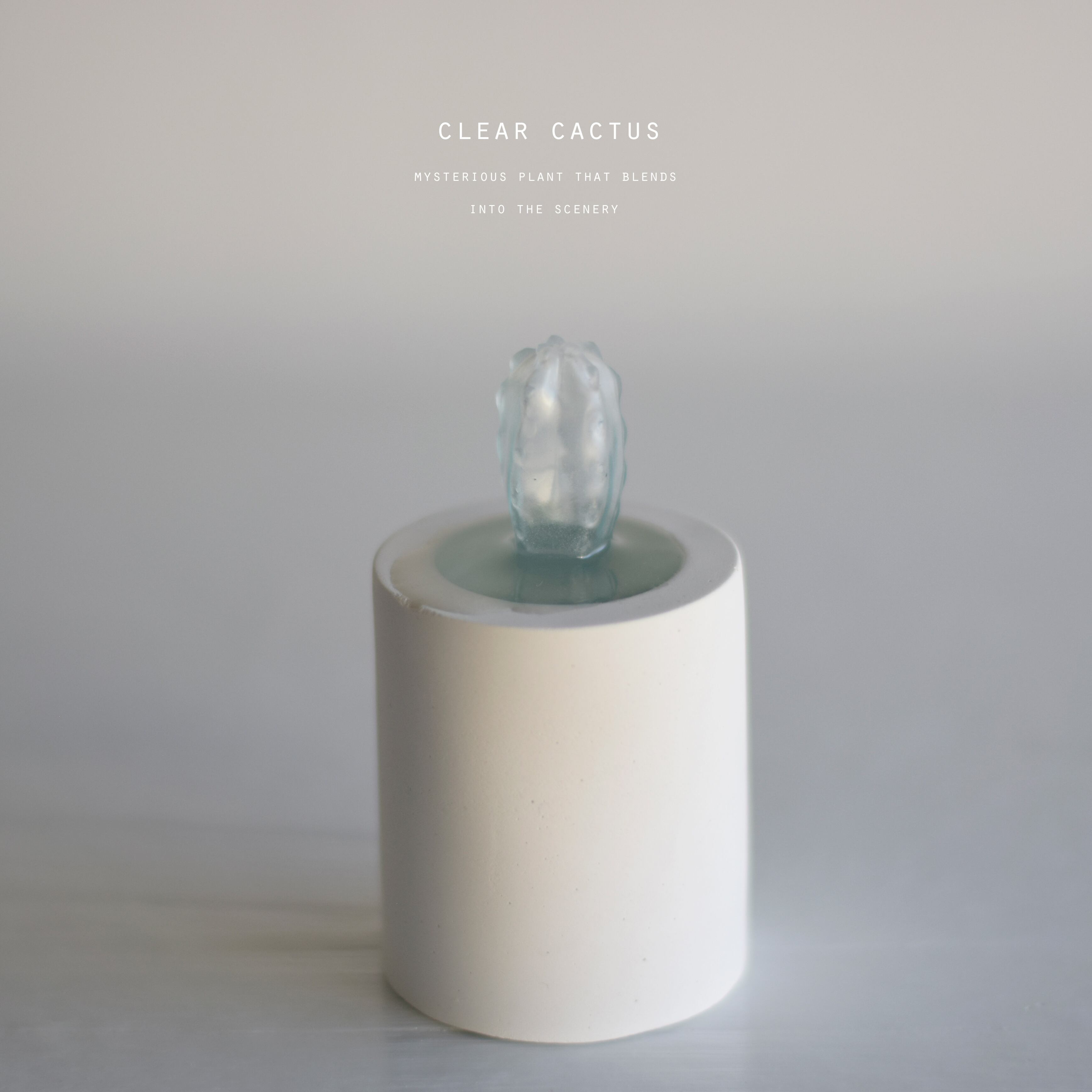 透明サボテンは内側が空洞になった薄い(厚さ1~2ミリ程)透明な樹脂で作った造形作品です。水を模した樹脂から生えています。