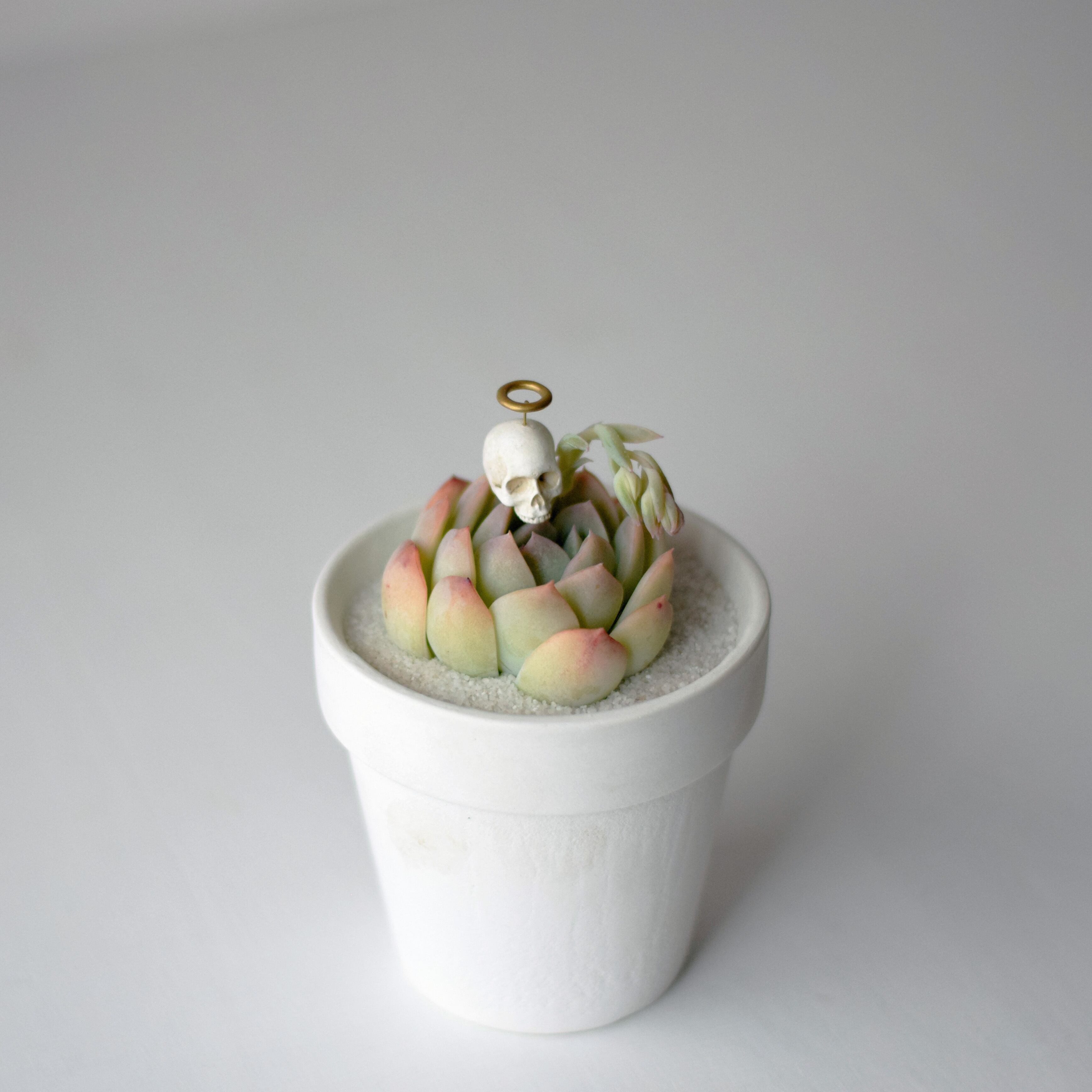 作品に合うように作ったホワイトモルタルの器に多肉植物suryeon×icegreenを植えています。