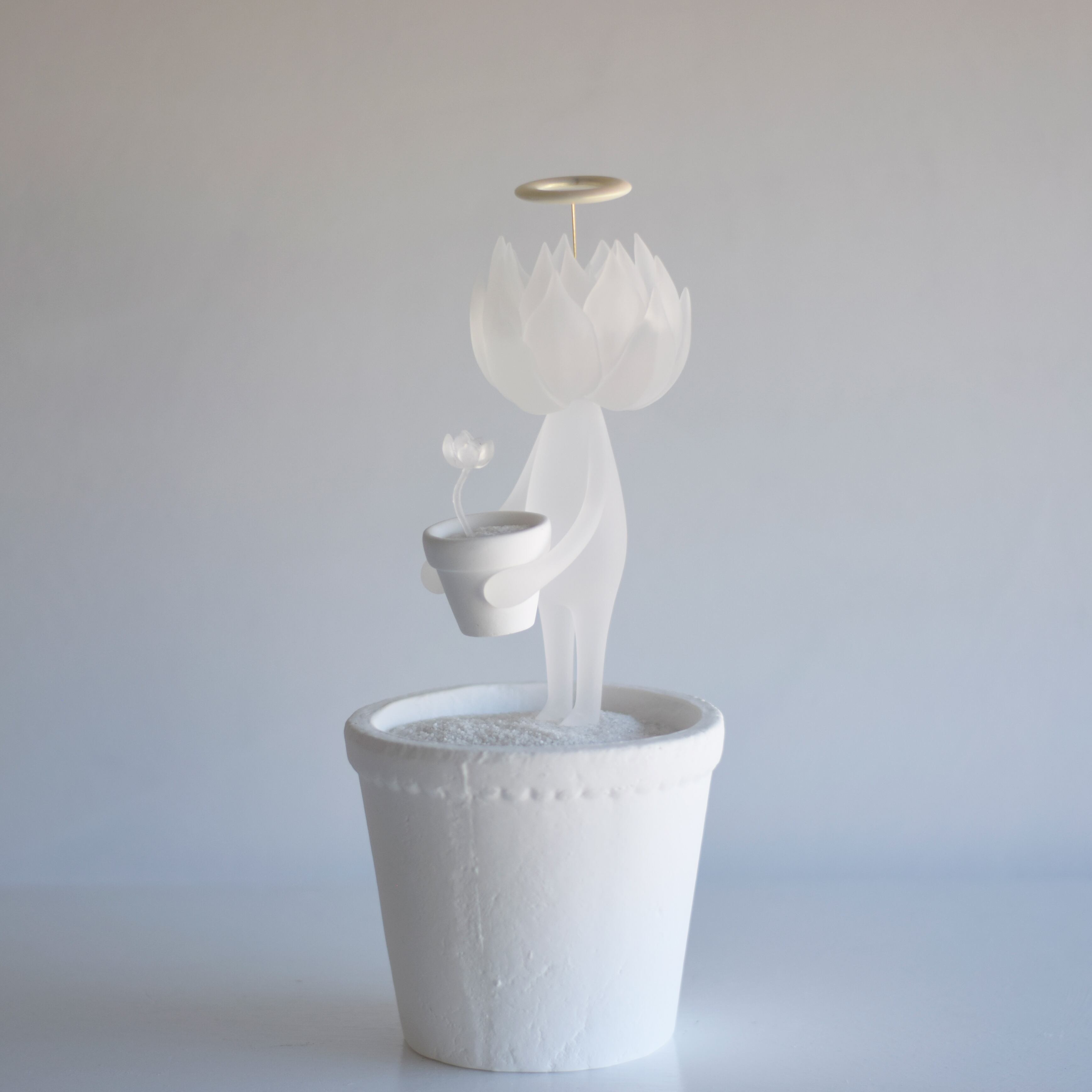 手には植木鉢を持ちとても小さな透明植物を育てています。(取り外し可能です)