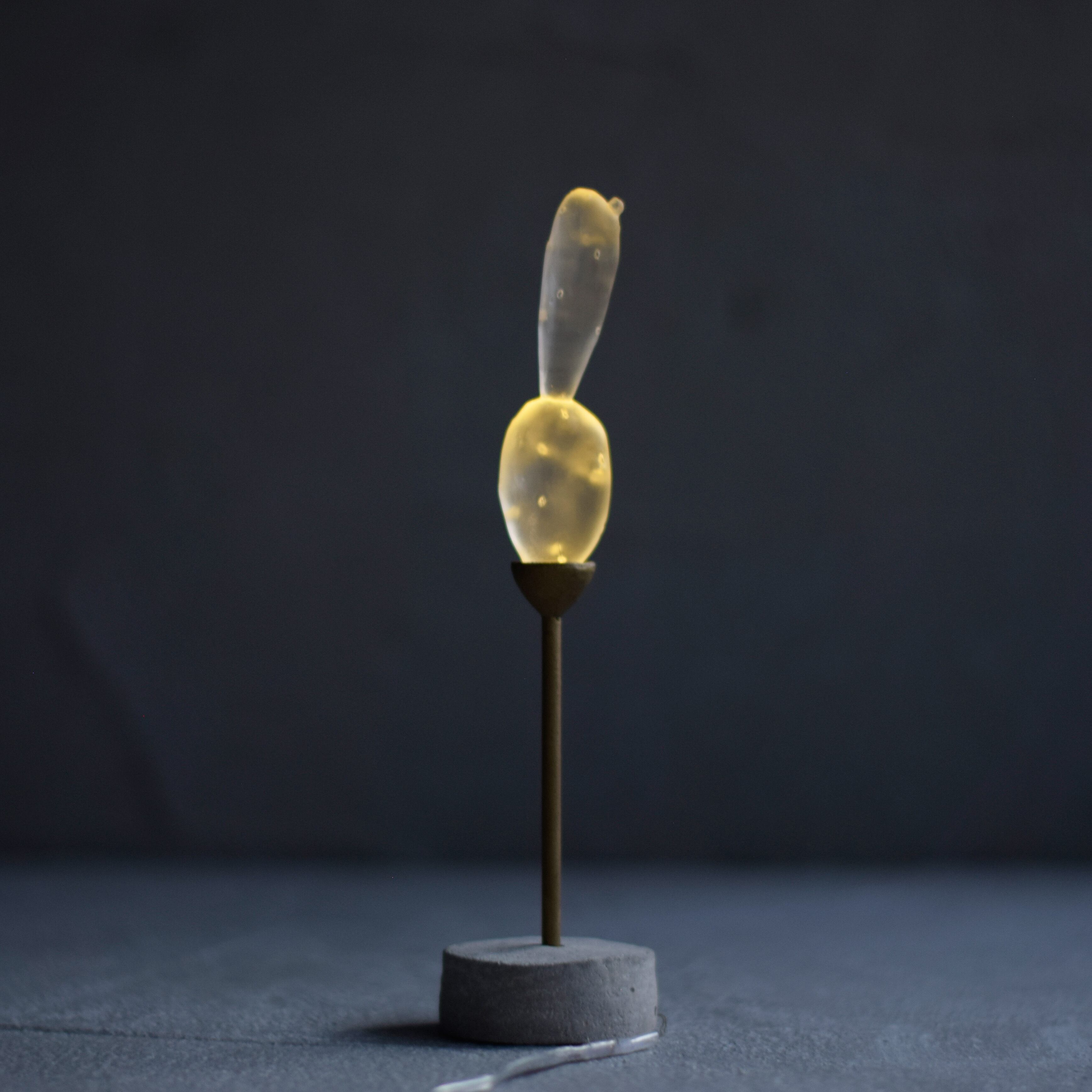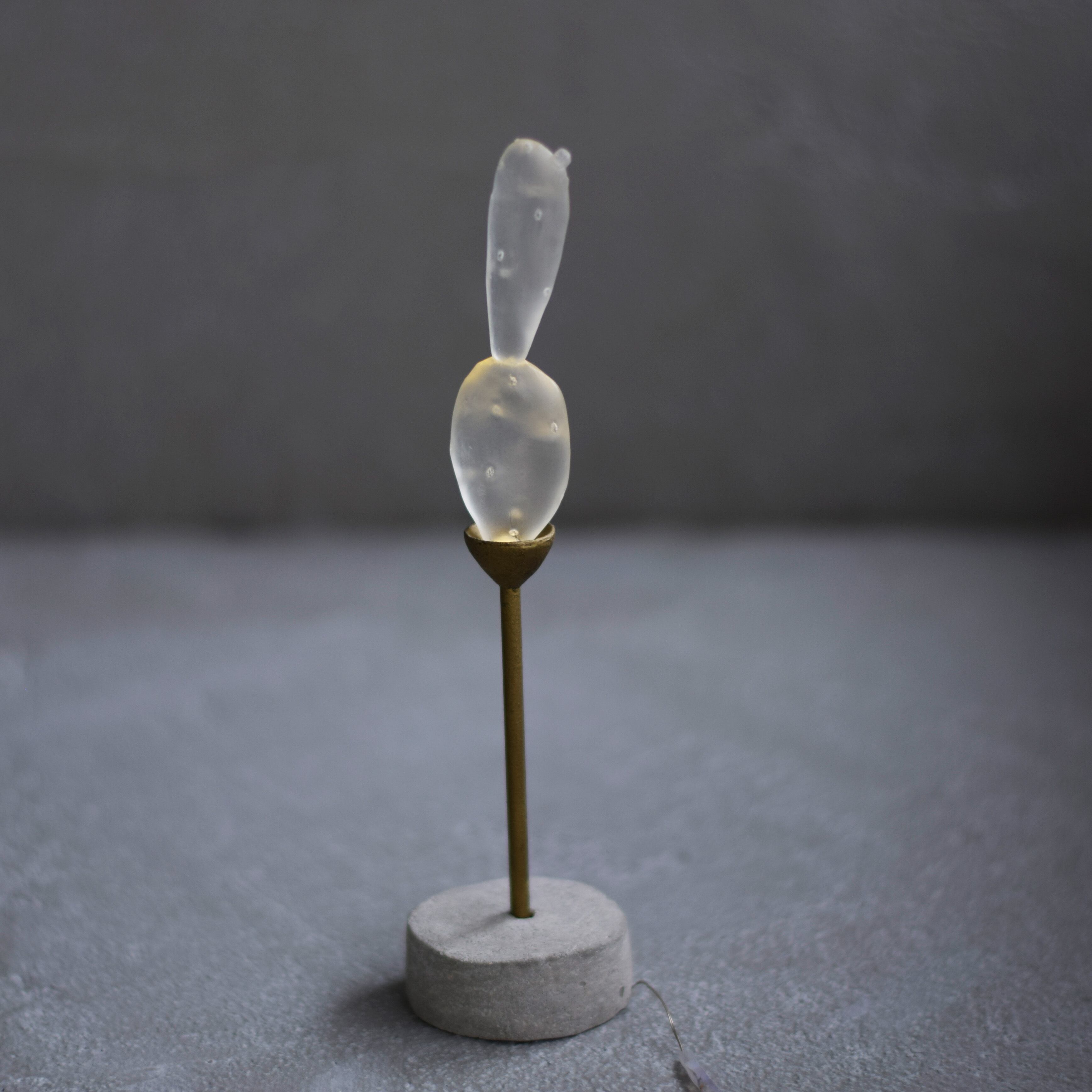 そのような設定で作られた樹脂製の透明サボテン(黒こけし)と真鍮、モルタル等で作られた手作りの灯りです。