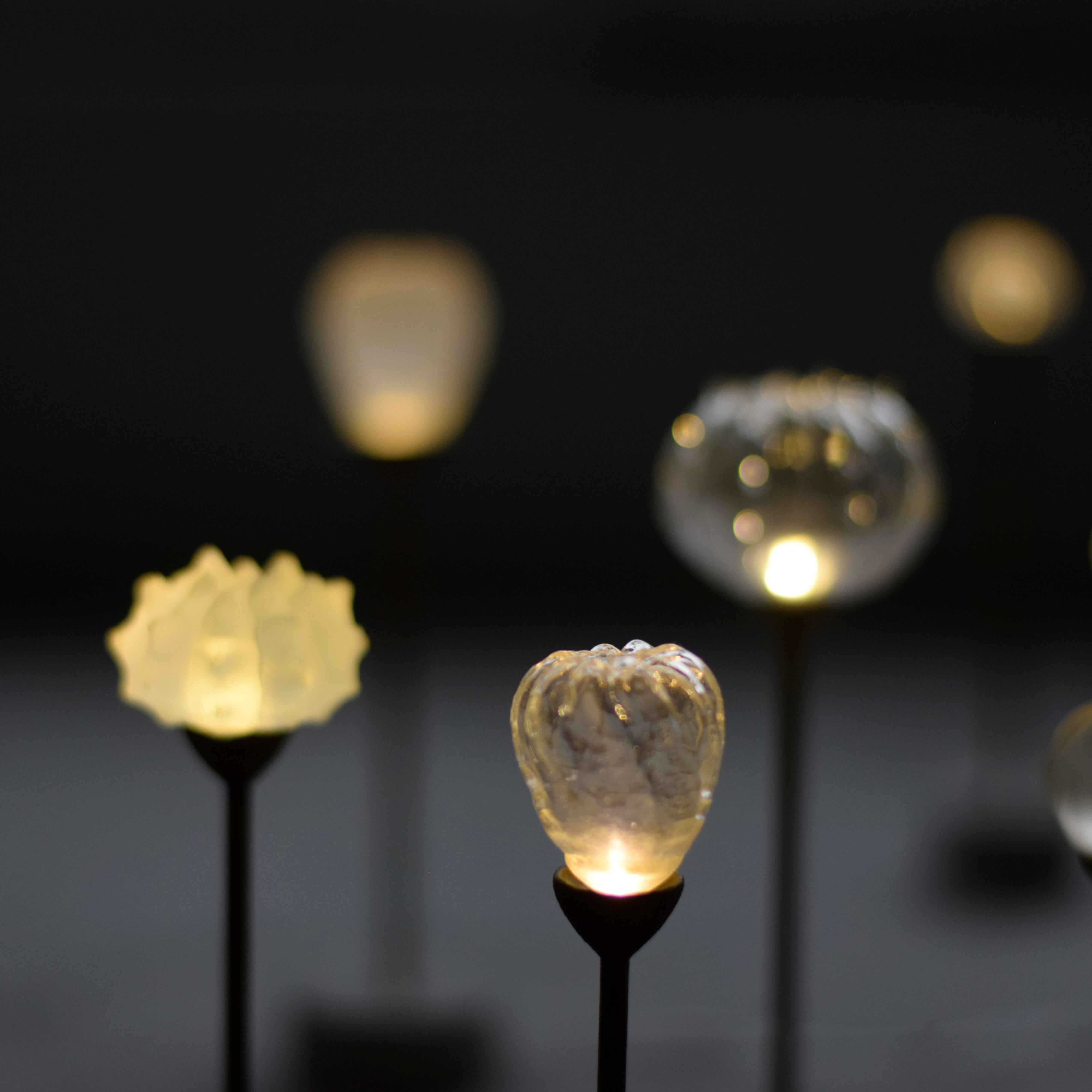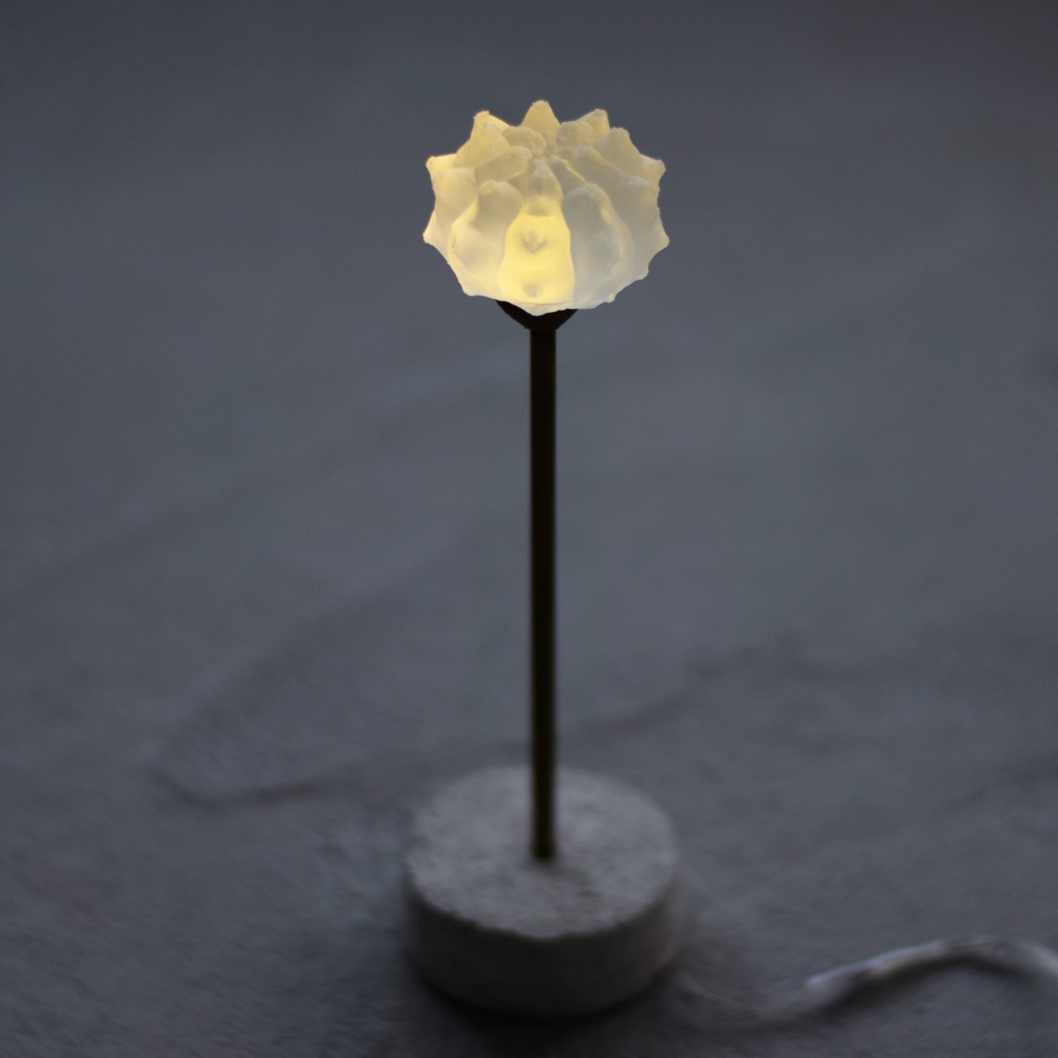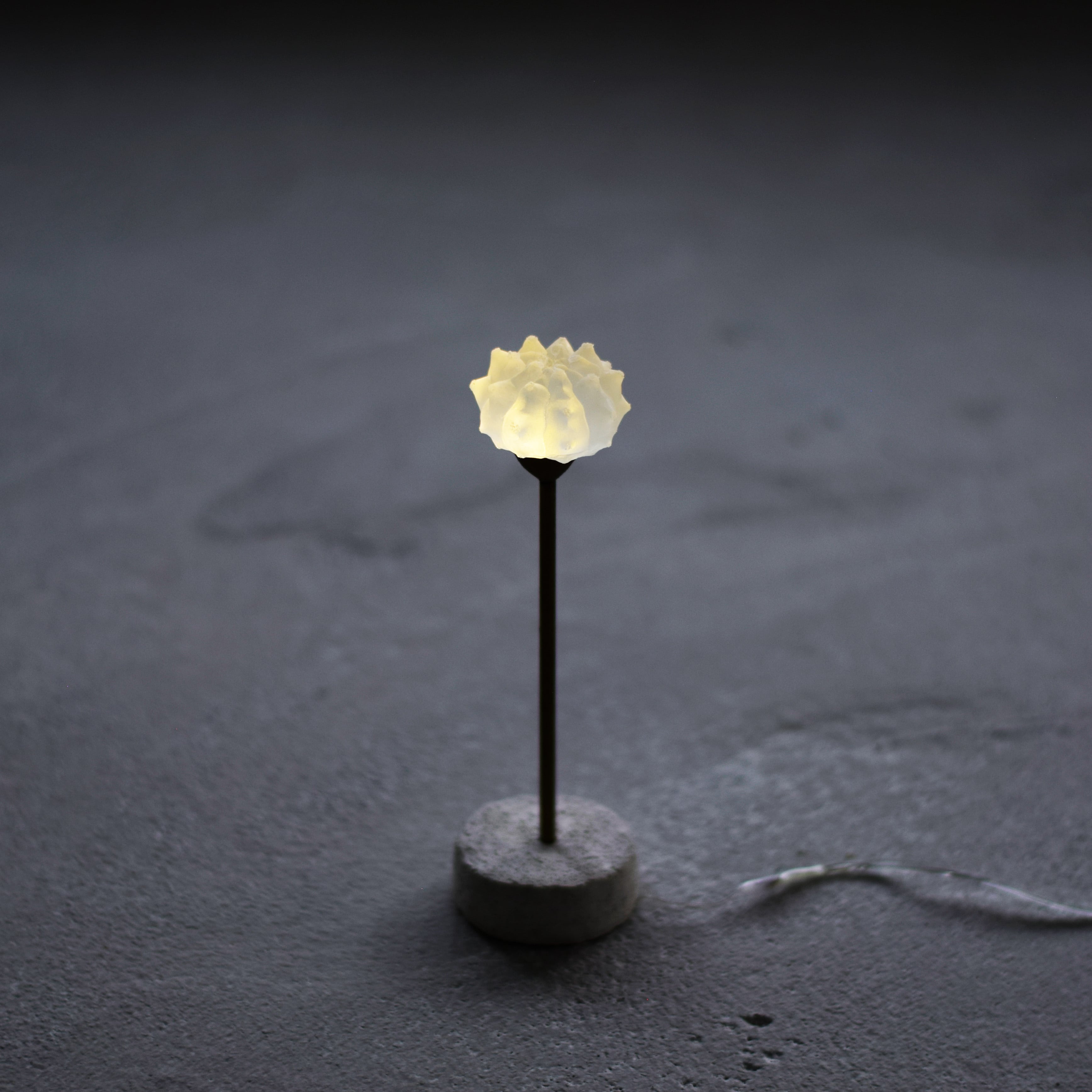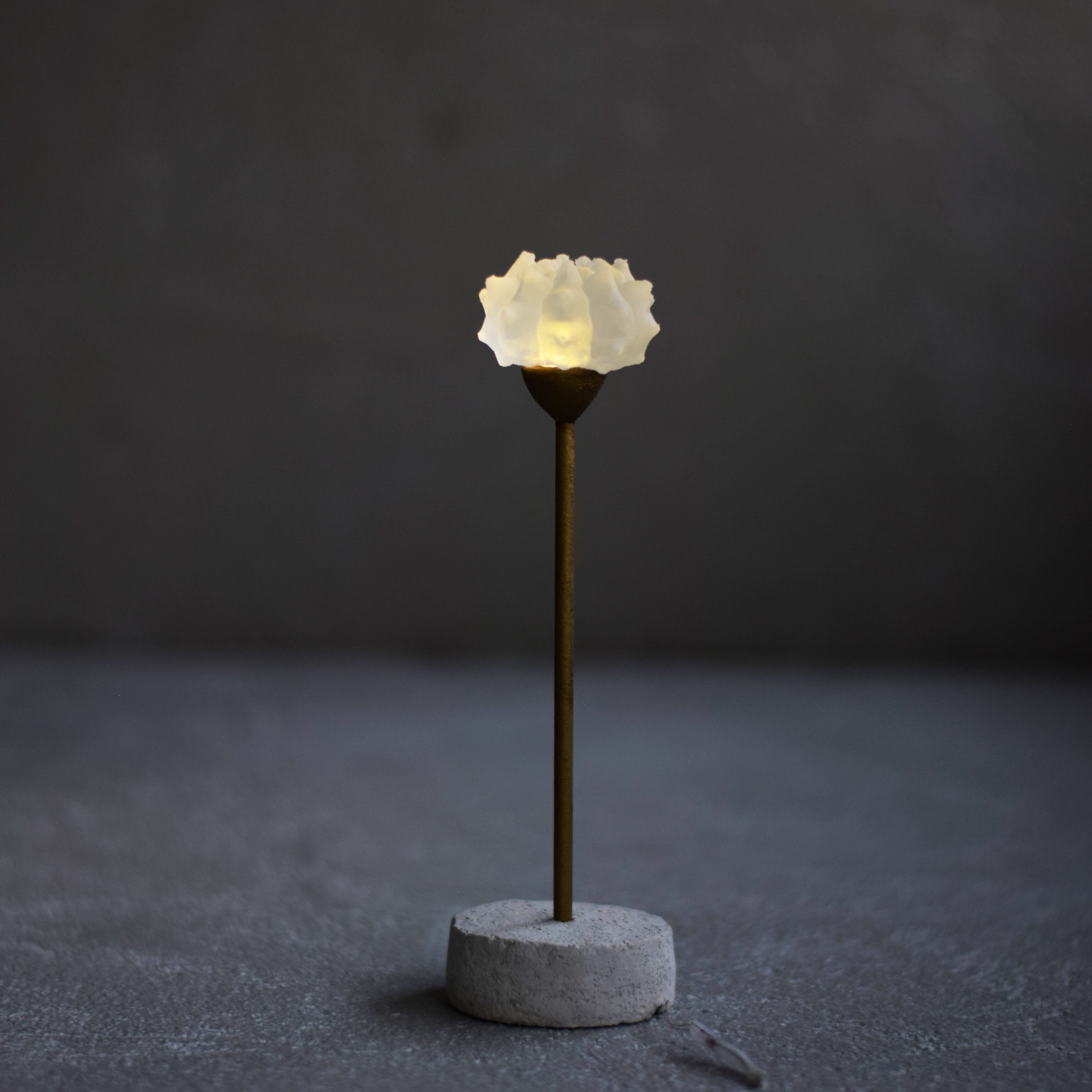そのような設定で作られた樹脂製の透明サボテン(翠晃冠)と真鍮、モルタル等で作られた手作りの灯りです。