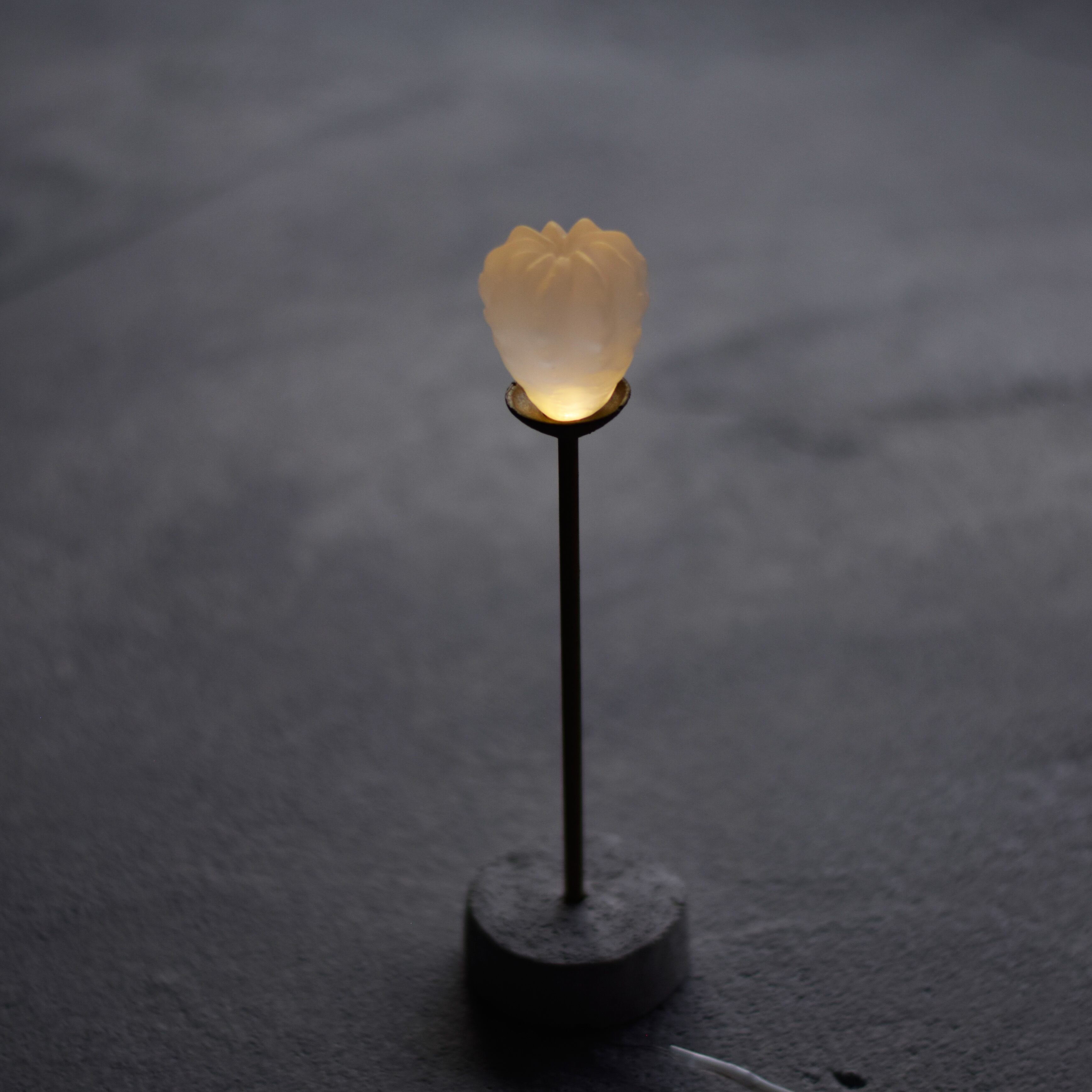 そのような設定で作られた樹脂製の透明サボテン(短毛丸)と真鍮、モルタル等で作られた手作りの灯りです。